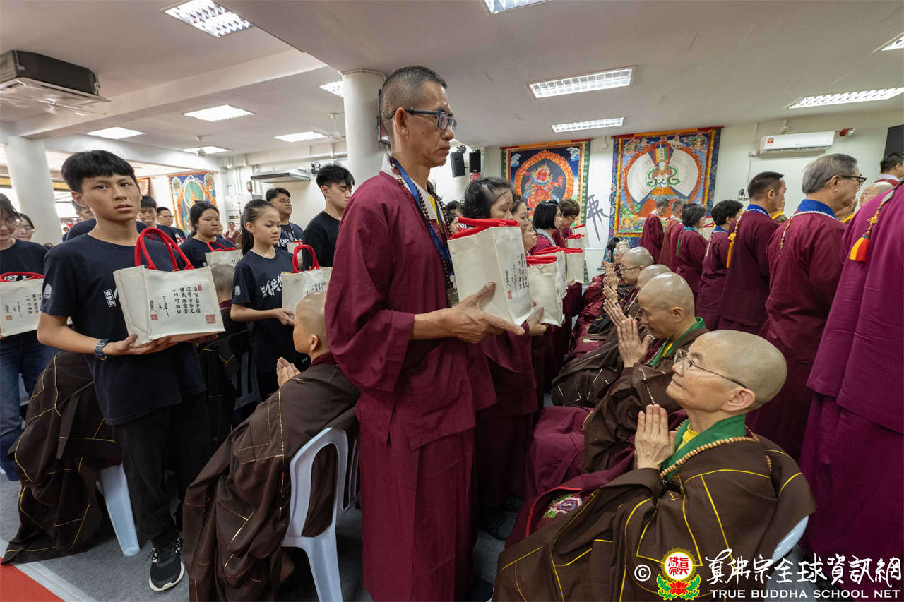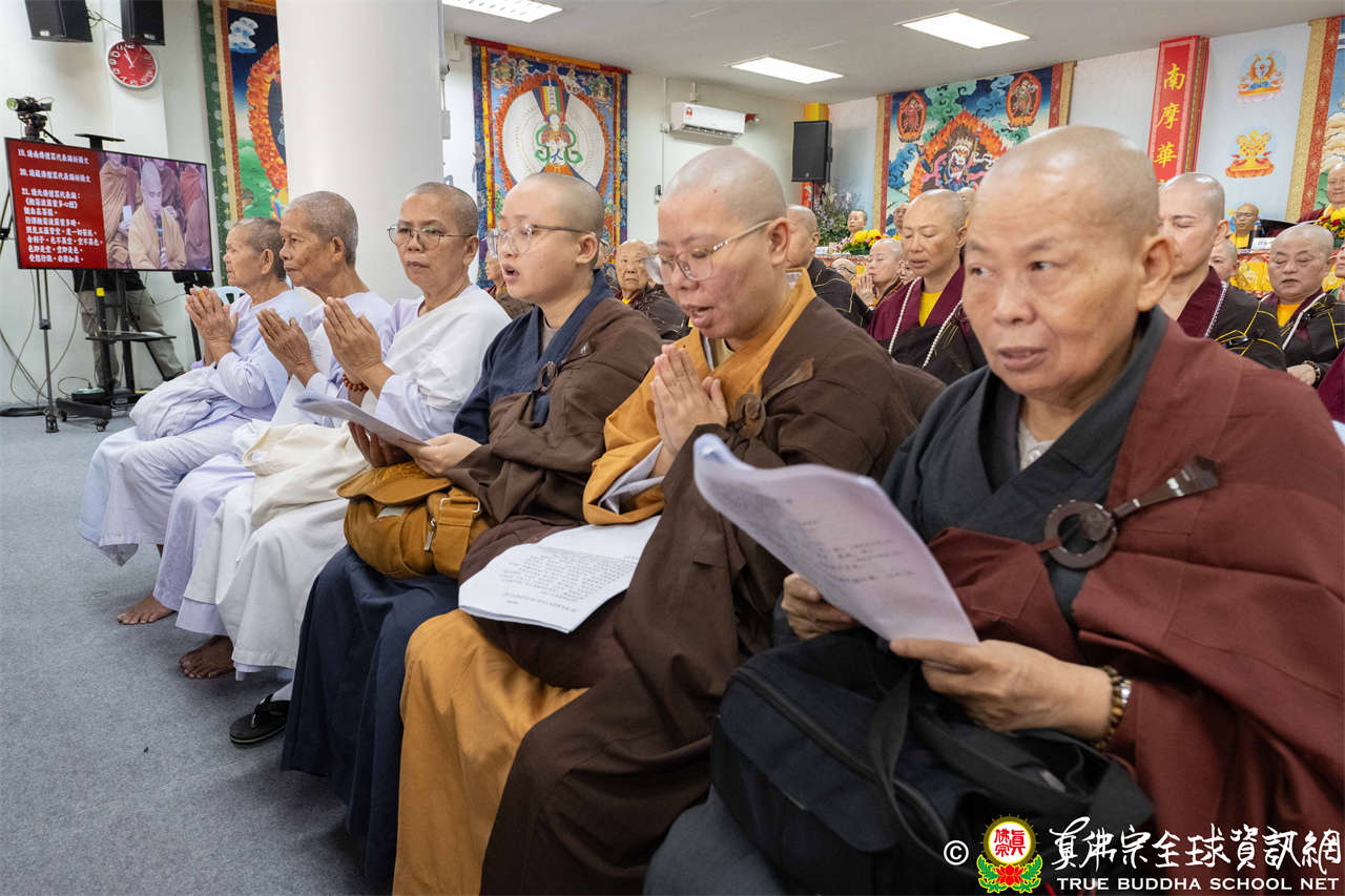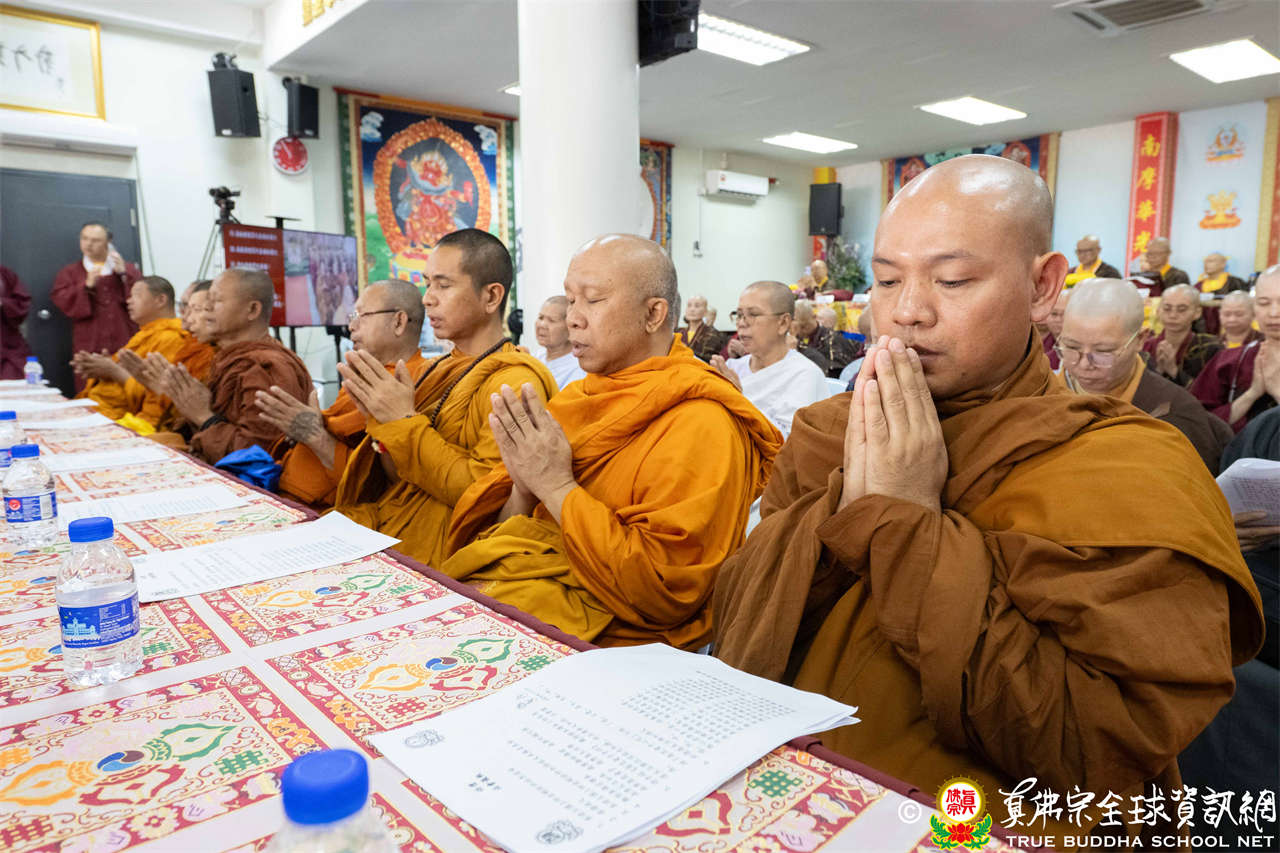 供僧大會依循《真佛宗供僧儀軌》肅穆進行,由長老釋蓮栽上師代表根本上師聖尊蓮生活佛盧勝彥納受信眾供養,並代表供養住世羅漢賓頭盧尊者。全體真佛弟子齊聲念誦《請佛住世祈願文》,祈請根本上師常住世間、永轉法輪;現場亦有南傳僧人持誦巴利文《祈禱文》,北傳僧人念誦《大悲咒》及《心經》。隨後,眾同門善信向僧眾敬獻哈達與供養,並由釋蓮栽長老開示佛法,供僧大會圓滿。