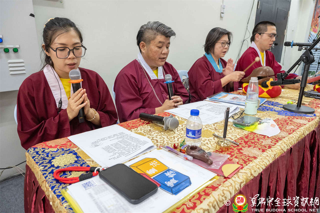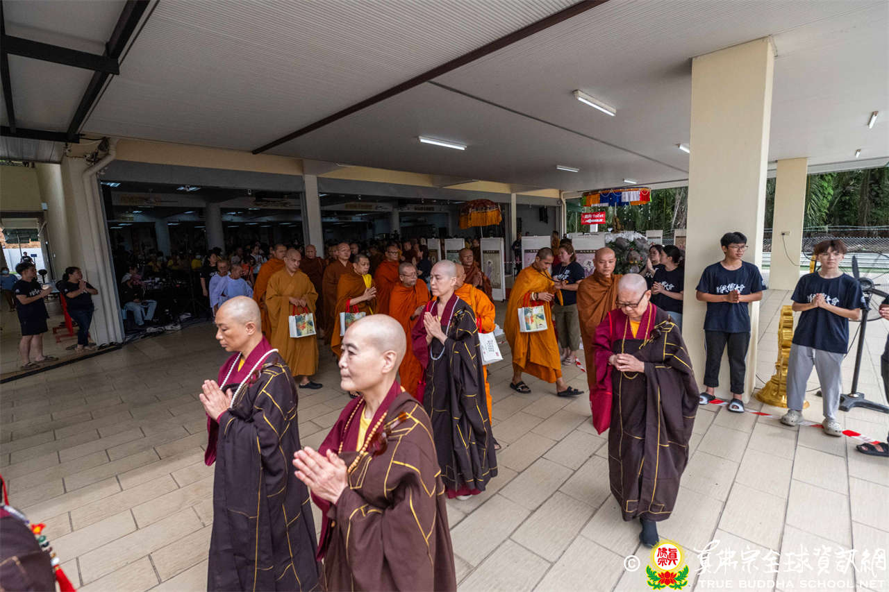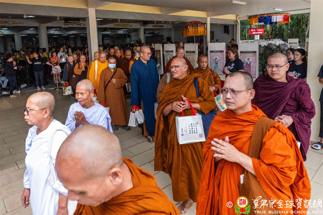 供僧大會依循《真佛宗供僧儀軌》肅穆進行,由長老釋蓮栽上師代表根本上師聖尊蓮生活佛盧勝彥納受信眾供養,並代表供養住世羅漢賓頭盧尊者。全體真佛弟子齊聲念誦《請佛住世祈願文》,祈請根本上師常住世間、永轉法輪;現場亦有南傳僧人持誦巴利文《祈禱文》,北傳僧人念誦《大悲咒》及《心經》。隨後,眾同門善信向僧眾敬獻哈達與供養,並由釋蓮栽長老開示佛法,供僧大會圓滿。