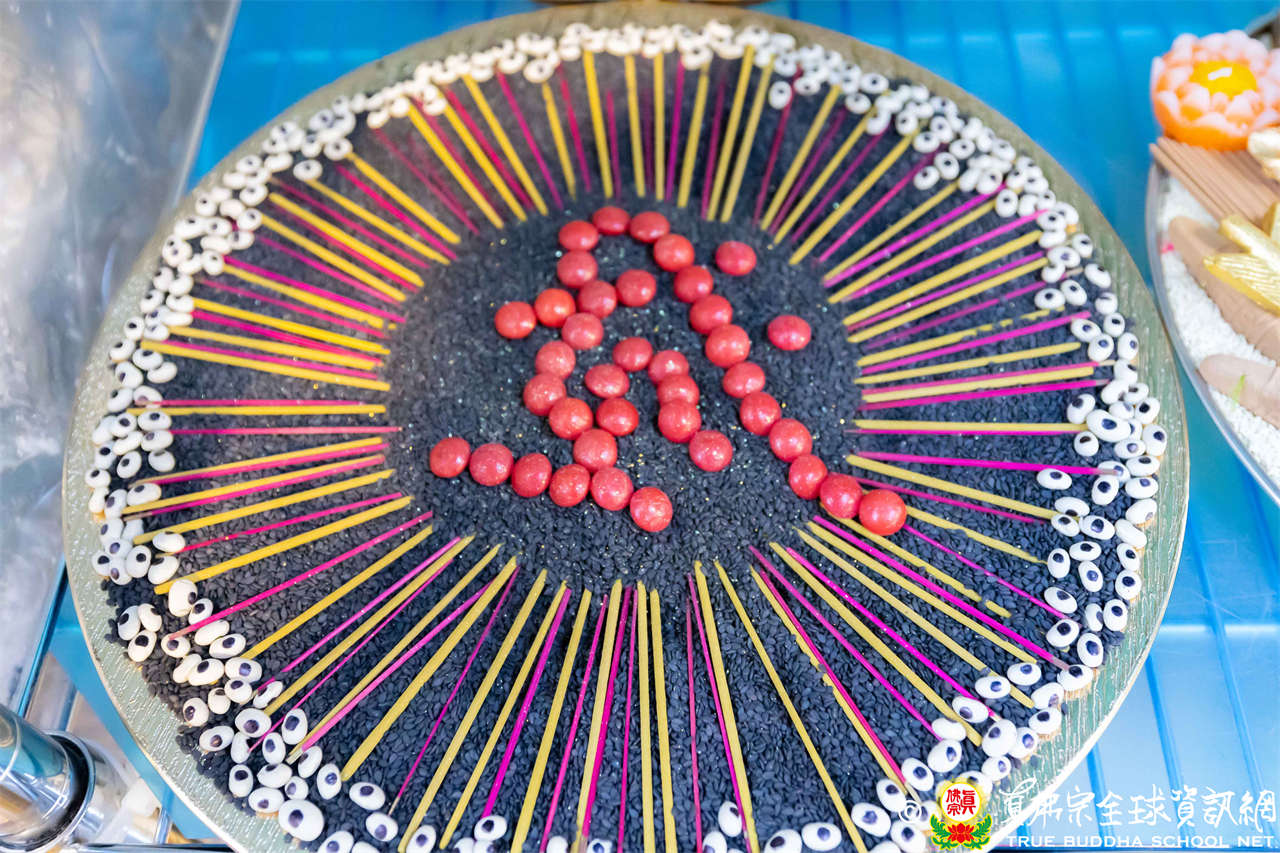 接著,法王分享了是日主尊——萬佛手無極眼瑤池金母大天尊在法會前夕的特別開示。法王曾請示金母對供品的特別要求,金母僅簡潔答覆:「你不要用骯髒的杯子裝水來供養我。」