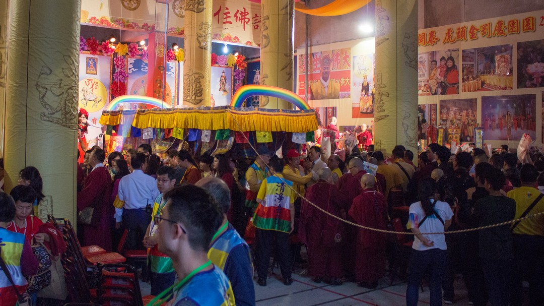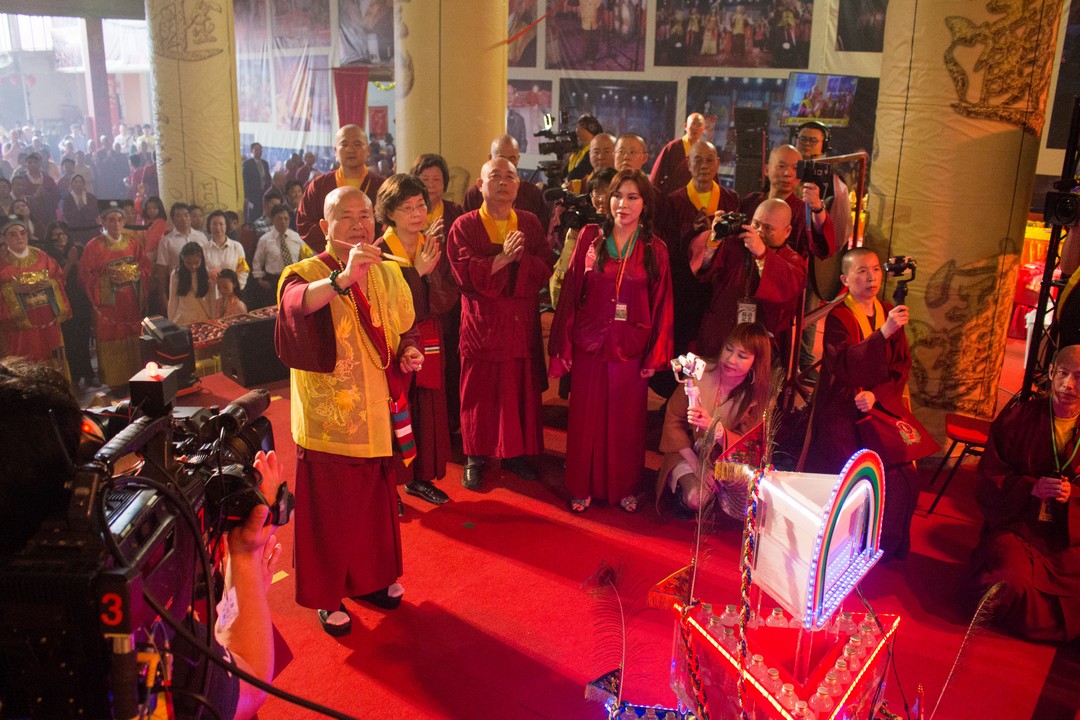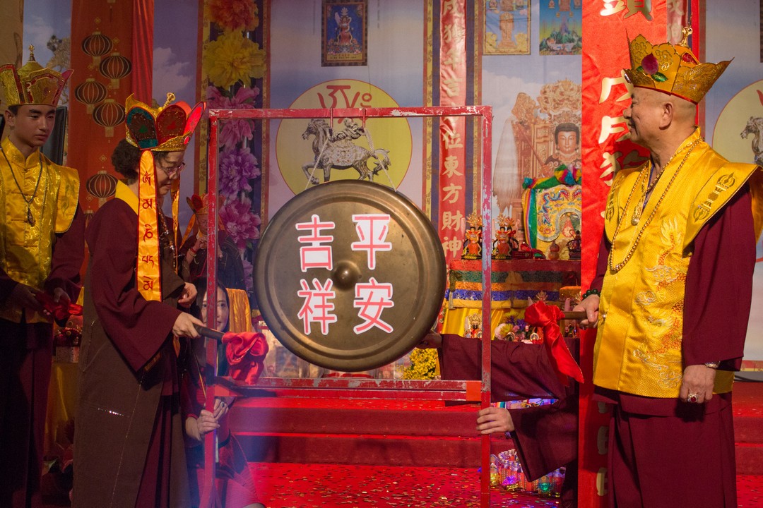 法王開示完畢,大眾抱以熱烈掌聲,感恩蓮生法王的寶貴開示。接著蓮生法王慈悲做總加持及打招財鼓,與師母蓮香上師、吐登悉地仁波切一同拉放新春彩球及敲響平安鑼,加持所有功德主接財神。最後賜授與會大眾「金面金母不共大法」灌頂,法會圓滿結束。
