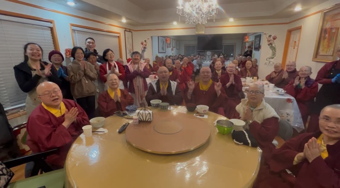 每逢除夕,西雅圖雷藏寺皆舉辦溫馨的圍爐聚餐,讓海內外善信歡聚一堂,互道新年快樂。今年同樣座無虛席,住持蓮吟上師還特地拍攝大眾用餐的短片,說要呈請師尊、師母觀看。只見現場人人對著鏡頭,熱情的向師尊、師母喊出誠摯的祝福,字字句句滿含無限的孺慕之情。
