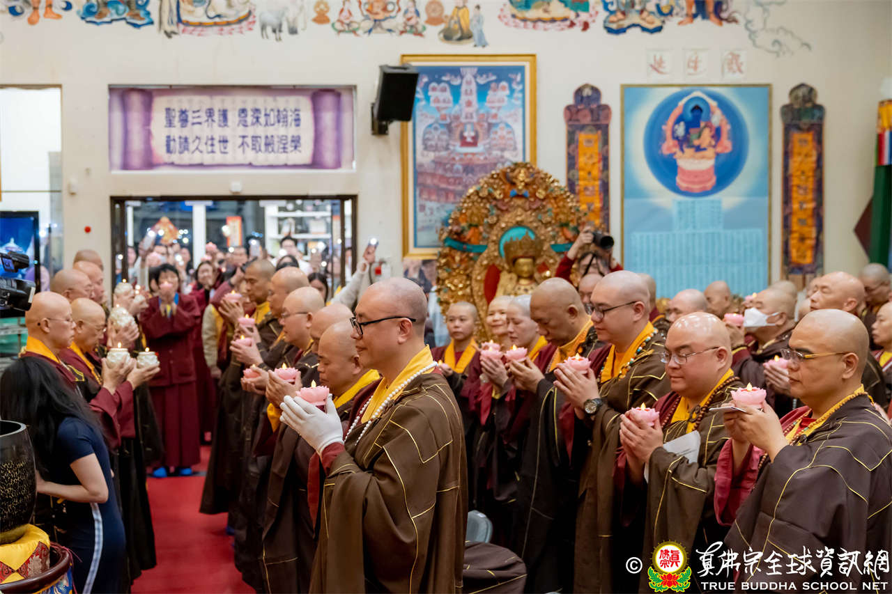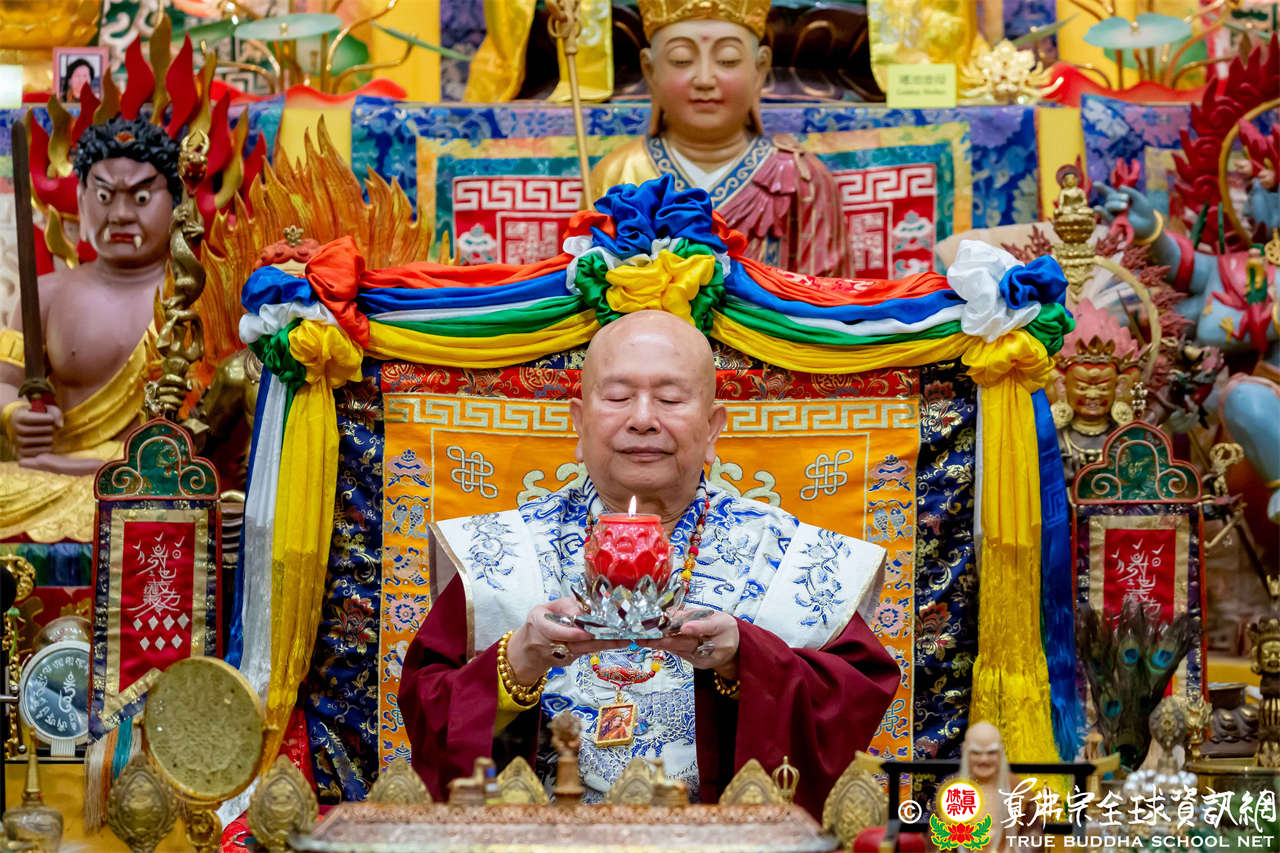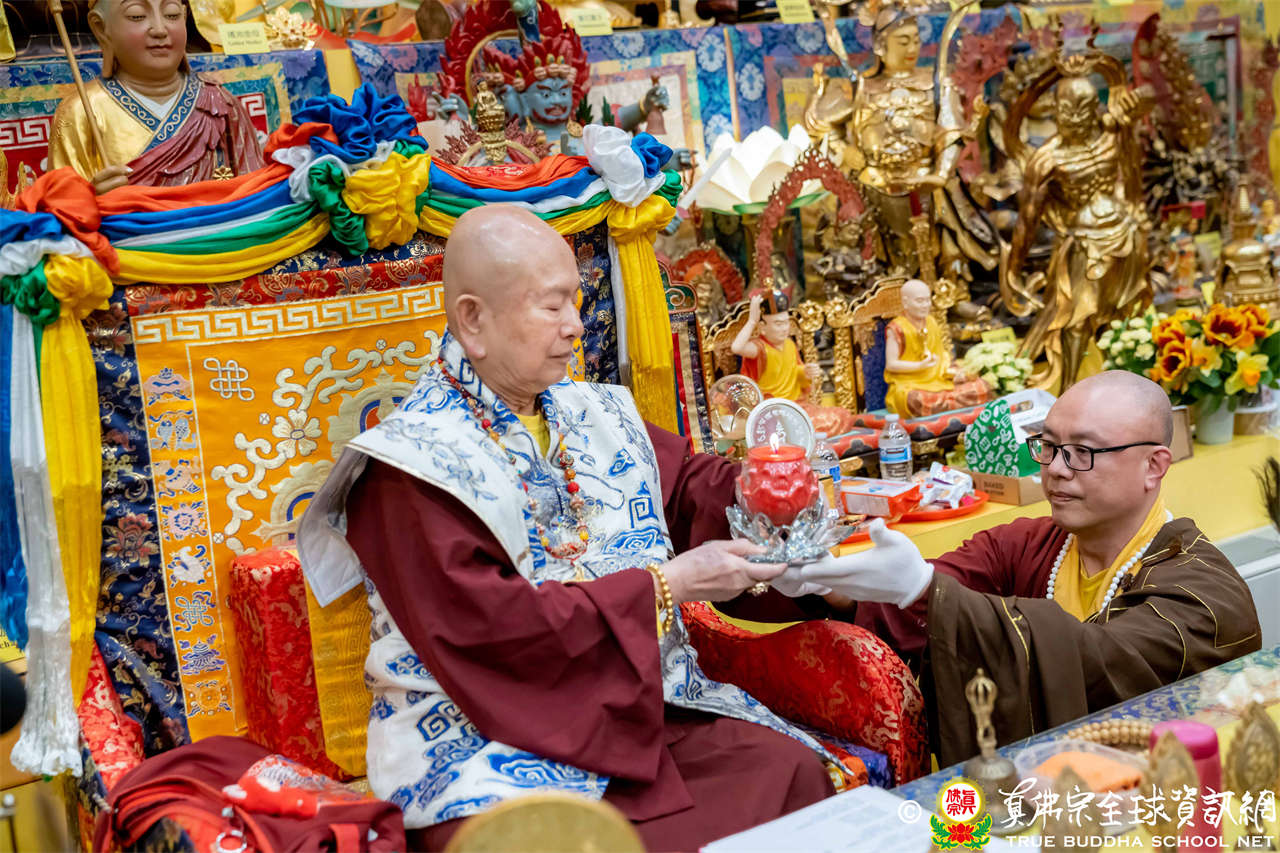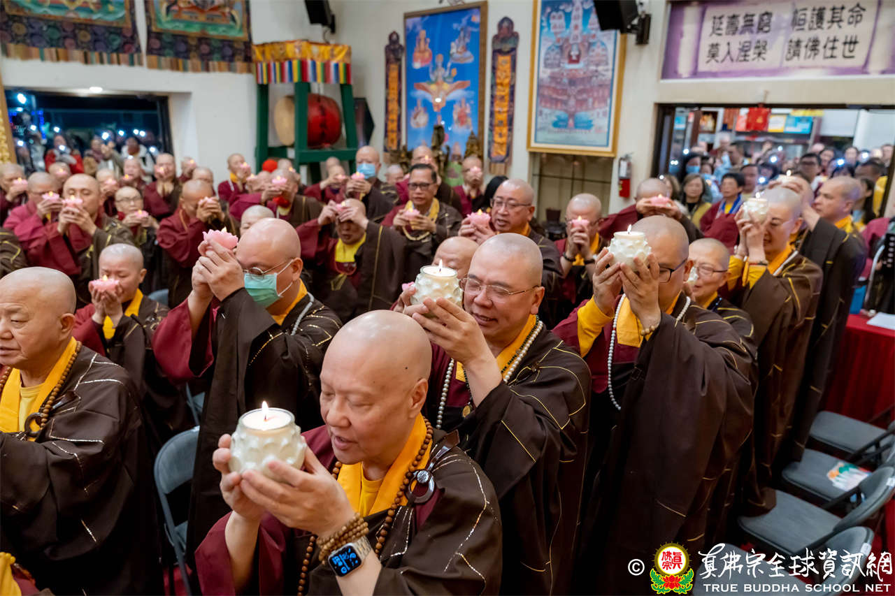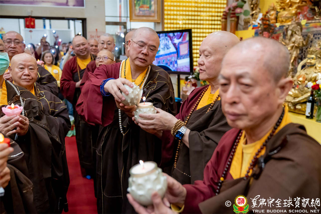 接著,進行莊嚴隆重的傳燈儀式,根本上師點亮大眾的心燈,然後大眾唱請佛住世祈願文、供養僧眾、唱宗歌「感恩真佛」。