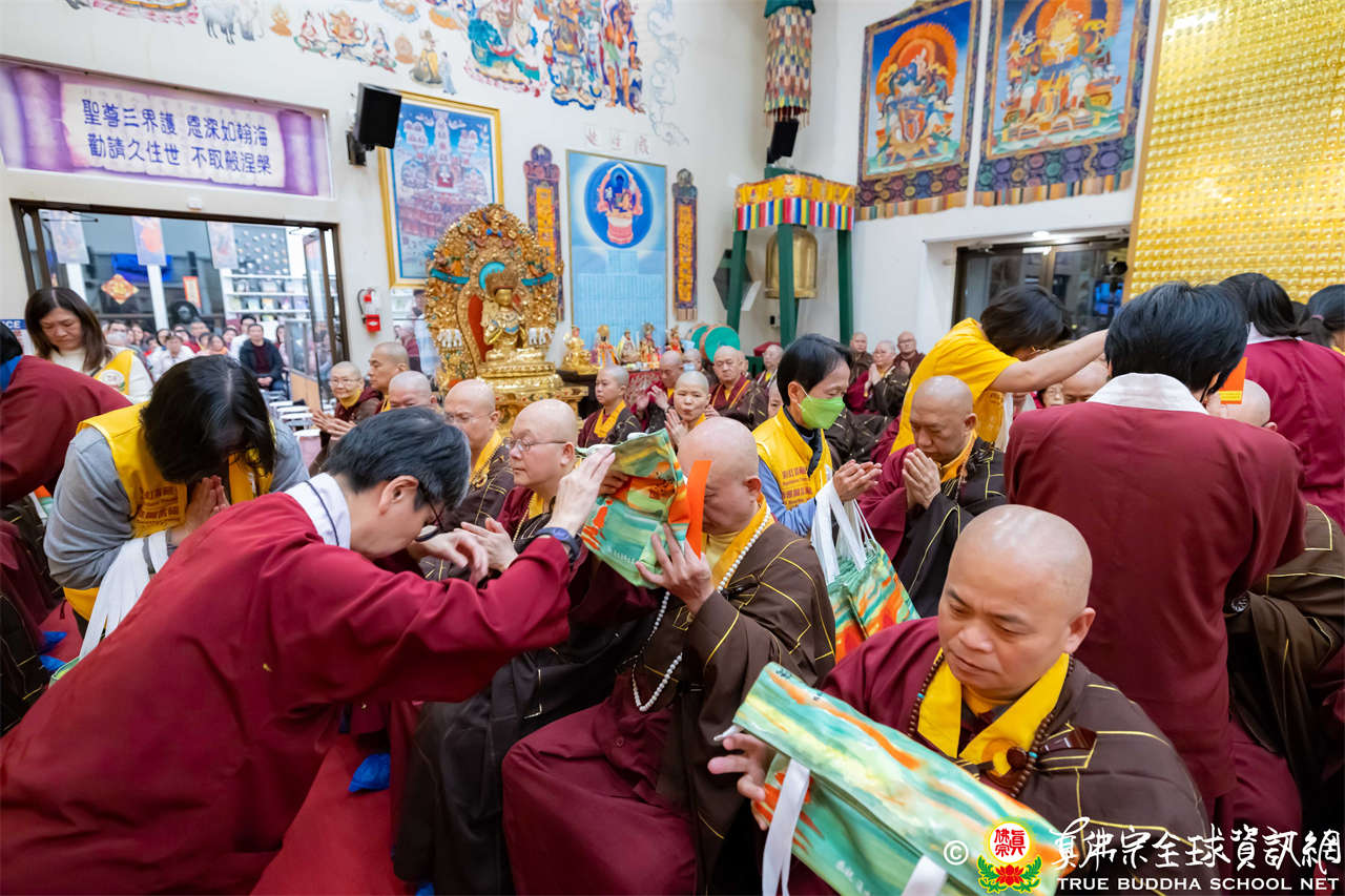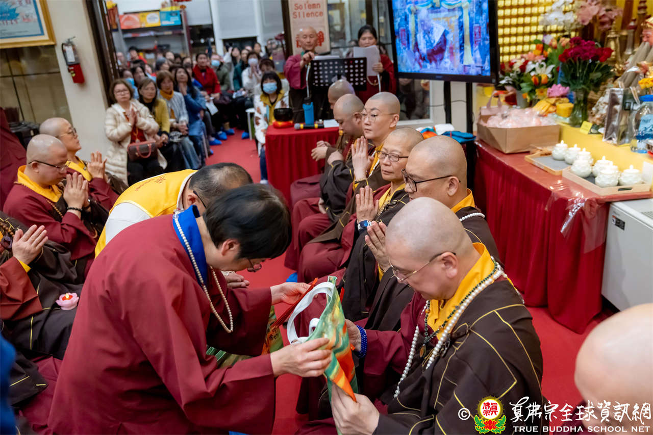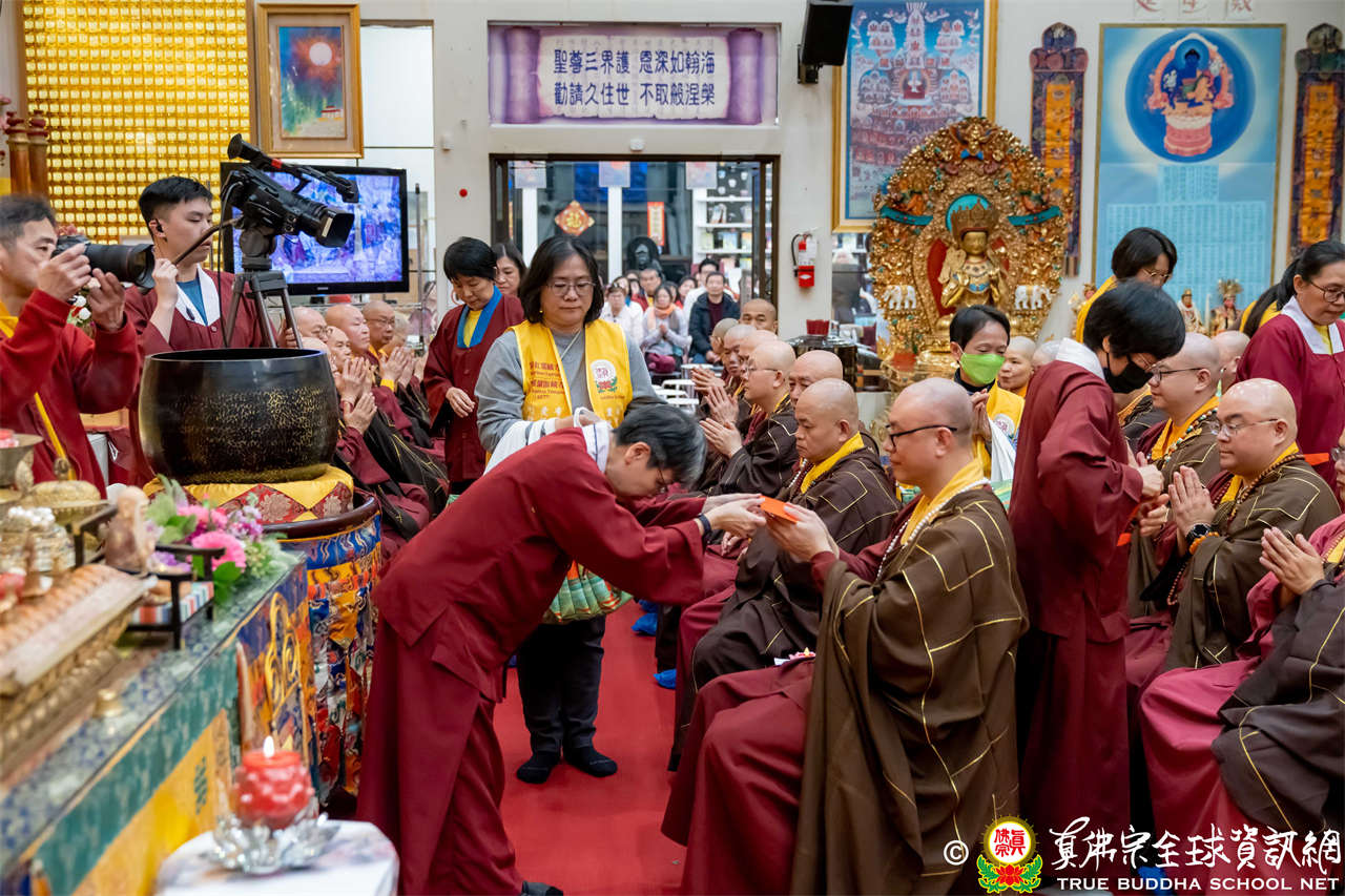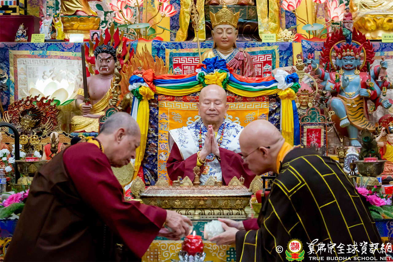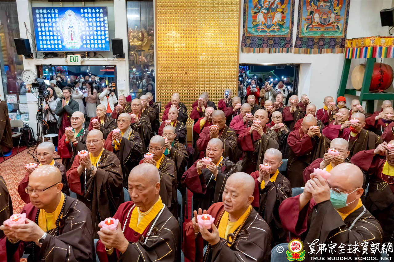 接著,進行莊嚴隆重的傳燈儀式,根本上師點亮大眾的心燈,然後大眾唱請佛住世祈願文、供養僧眾、唱宗歌「感恩真佛」。