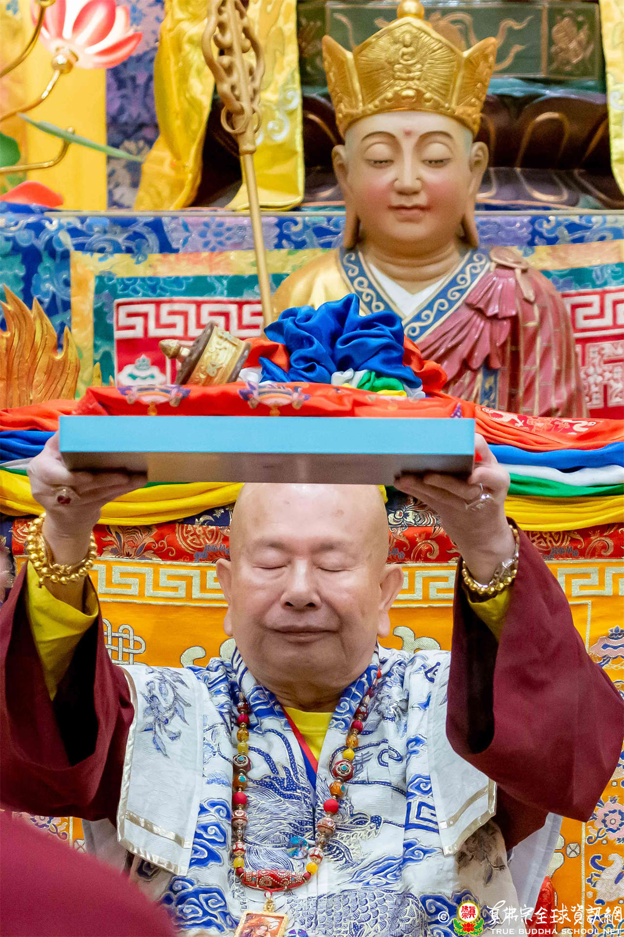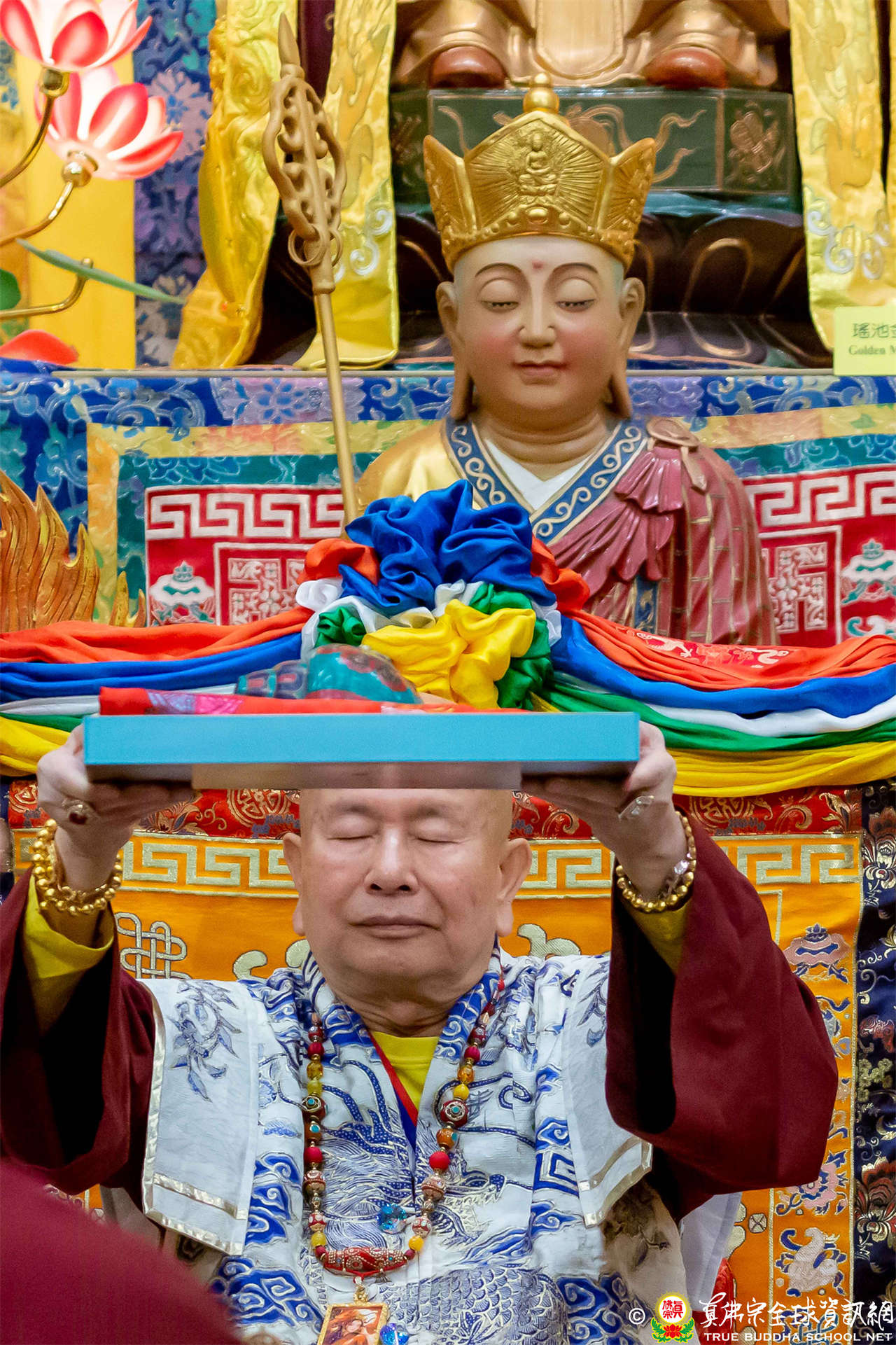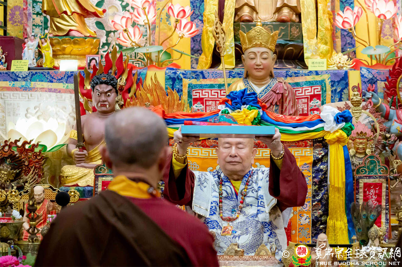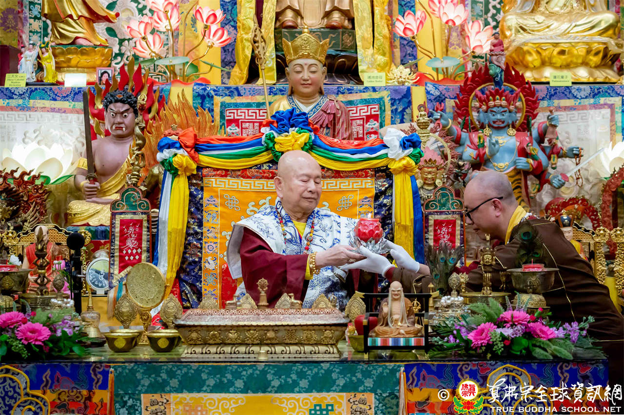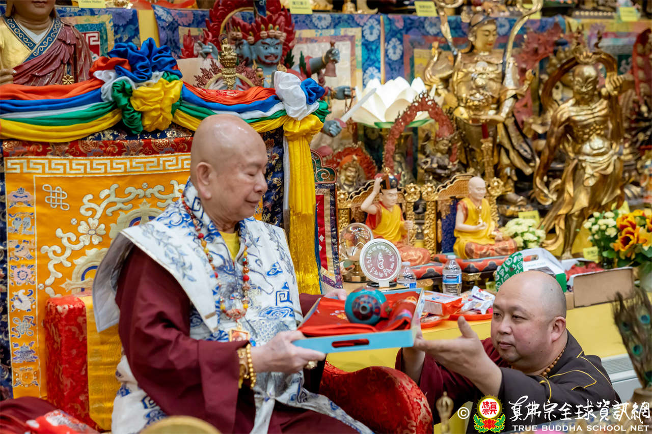 接著,進行莊嚴隆重的傳燈儀式,根本上師點亮大眾的心燈,然後大眾唱請佛住世祈願文、供養僧眾、唱宗歌「感恩真佛」。