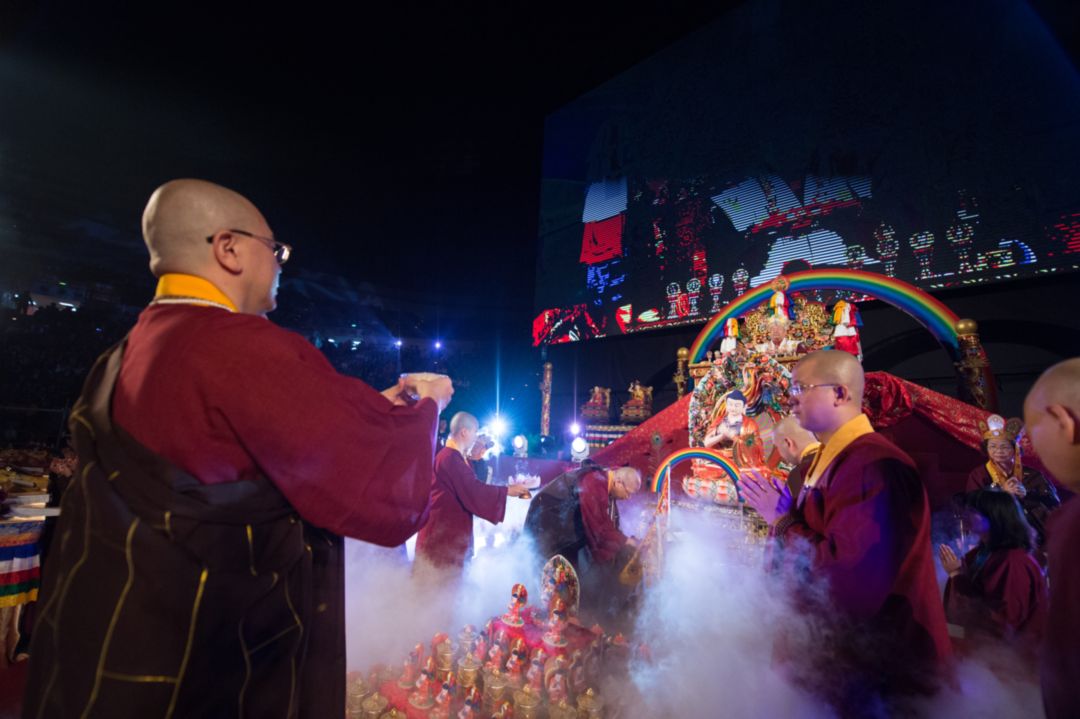 水供儀軌圓滿結束後,主辦單位台北〈中觀堂〉蓮悅上師和蓮妙上師代表全體與會者請佛住世。一時之間,請佛住世祈請文在會場迴蕩,咒字也在會場迴旋,與會者從心中發出深深的祈求,祈請法王住世轉法輪,皆淚眼盈眶。