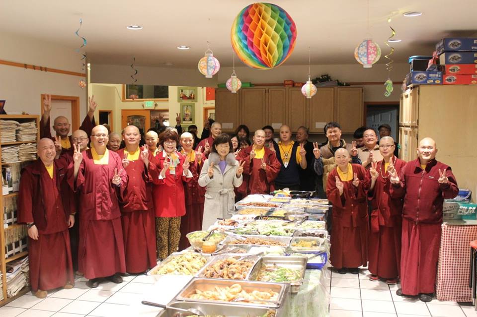 傍晚時西雅圖雷藏寺大飯店開始熱鬧起來,雷藏寺準備的美味餐點和大家帶來的佳餚擺滿了大長桌, 令人垂涎欲滴,用餐時刻到了,眾上師法師陸續進來與同門互相問候,最特別的是今年:師母蓮香上師也出席參加感恩餐會,眾人一陣熱烈的歡呼聲後, 開始享用美饌。