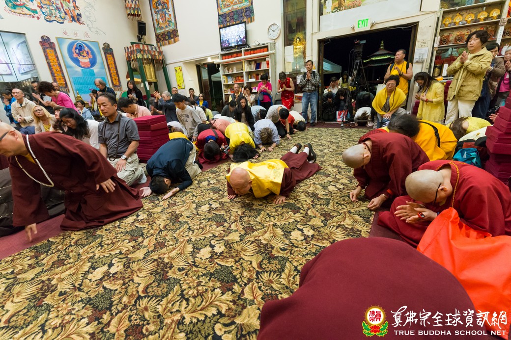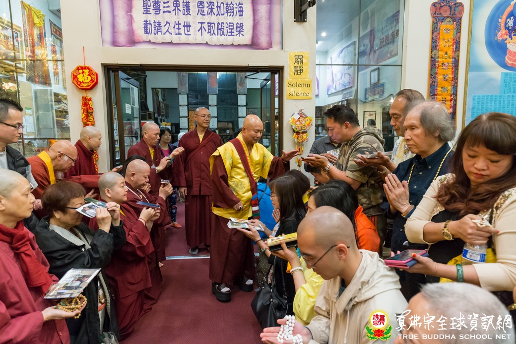 精采的開示結束後,聖尊為信眾賜授皈依灌頂、加持大悲咒水及開光佛像。離開廟前,聖尊慈悲的為大眾摩頂加持,讓大家所求皆能圓滿。看著聖尊步出大殿的慈悲身影,弟子們道不盡的感恩之情,內心深處衷心祈願著,我們慧命的父親蓮生聖尊健康自在、長久住世。