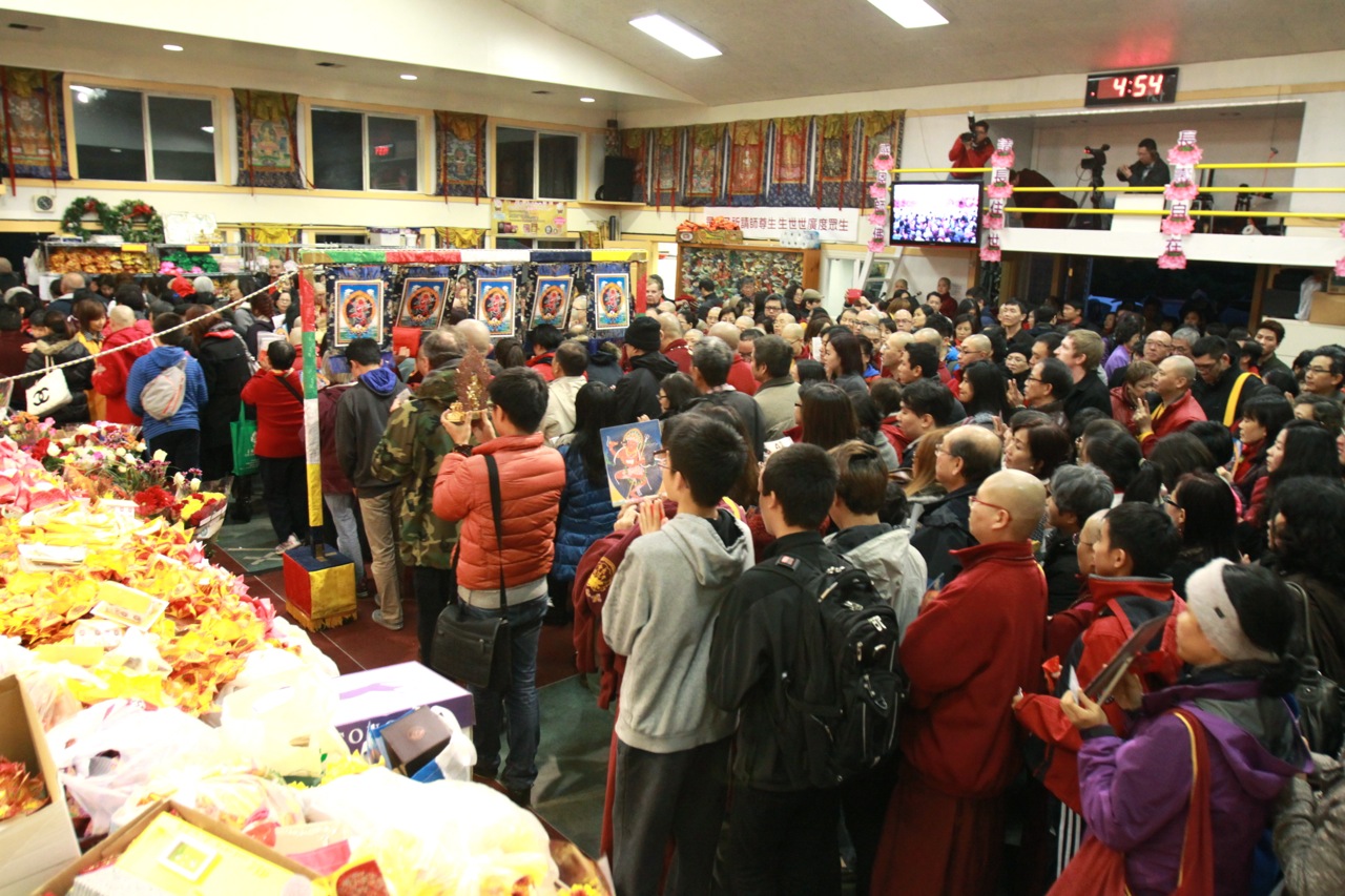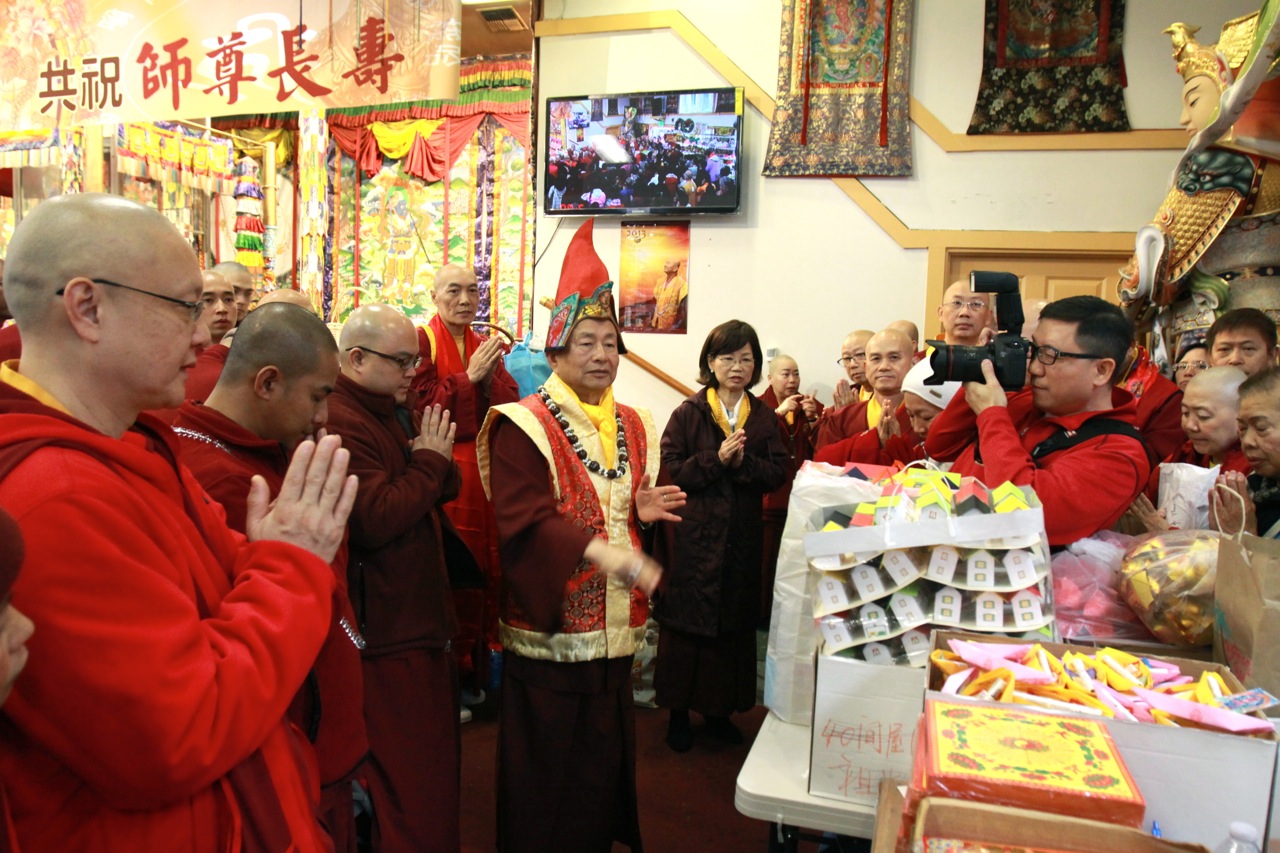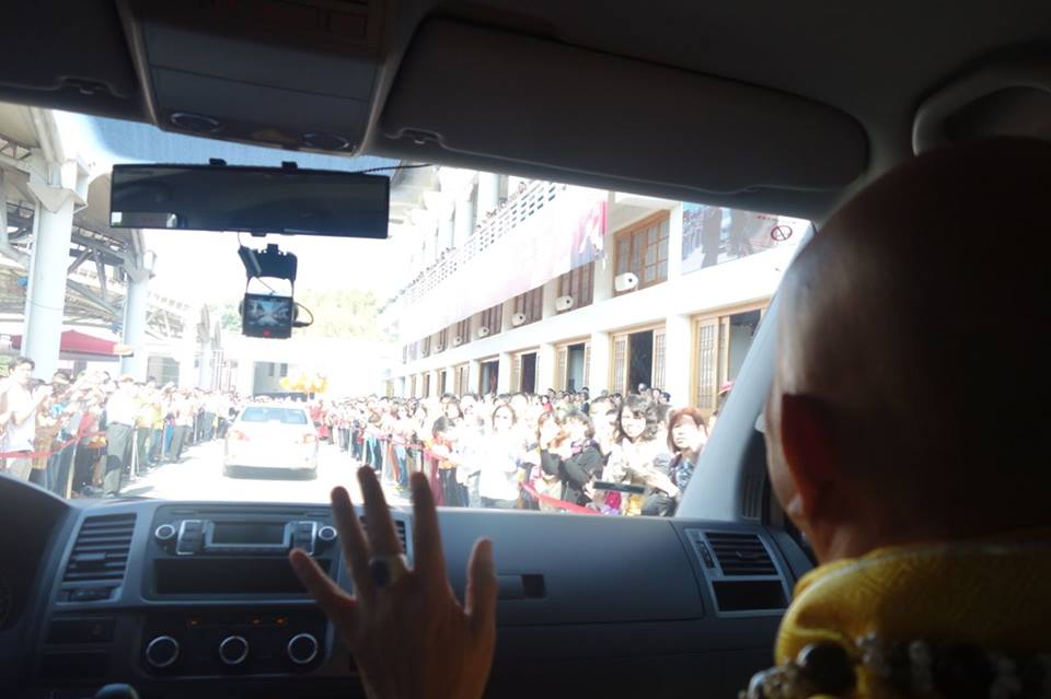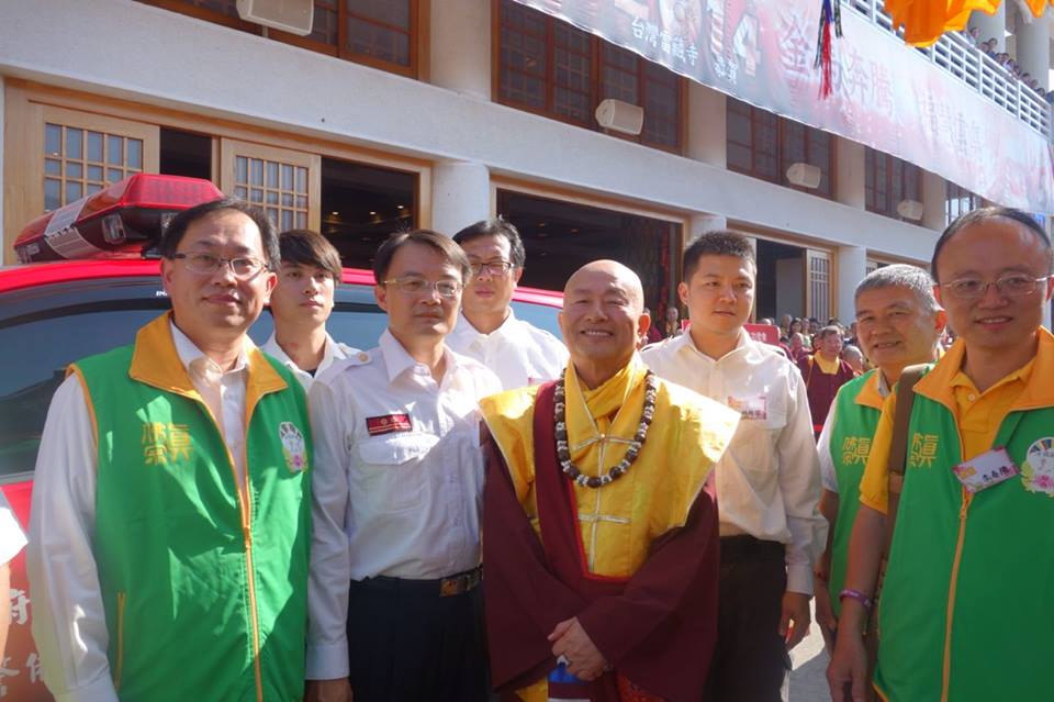 當蓮生活佛座車抵達雷藏寺後,立即響起如雷掌聲及歡呼聲。蓮生活佛並在真佛宗「華光功德會」理事長李春陽的陪同下,與受贈警備車的高雄消防局洪聖儀分隊長及三位隊員合影留念。在沈寂數月後的〈台灣雷藏寺〉,今日再度湧進上萬人潮,同門互道「好久不見」的問候聲此次彼落,報名處、流通處和廣場各攤位間,到處可見朝聖人潮。許多不見的雷藏寺密壇金光閃耀,令人法喜充滿。