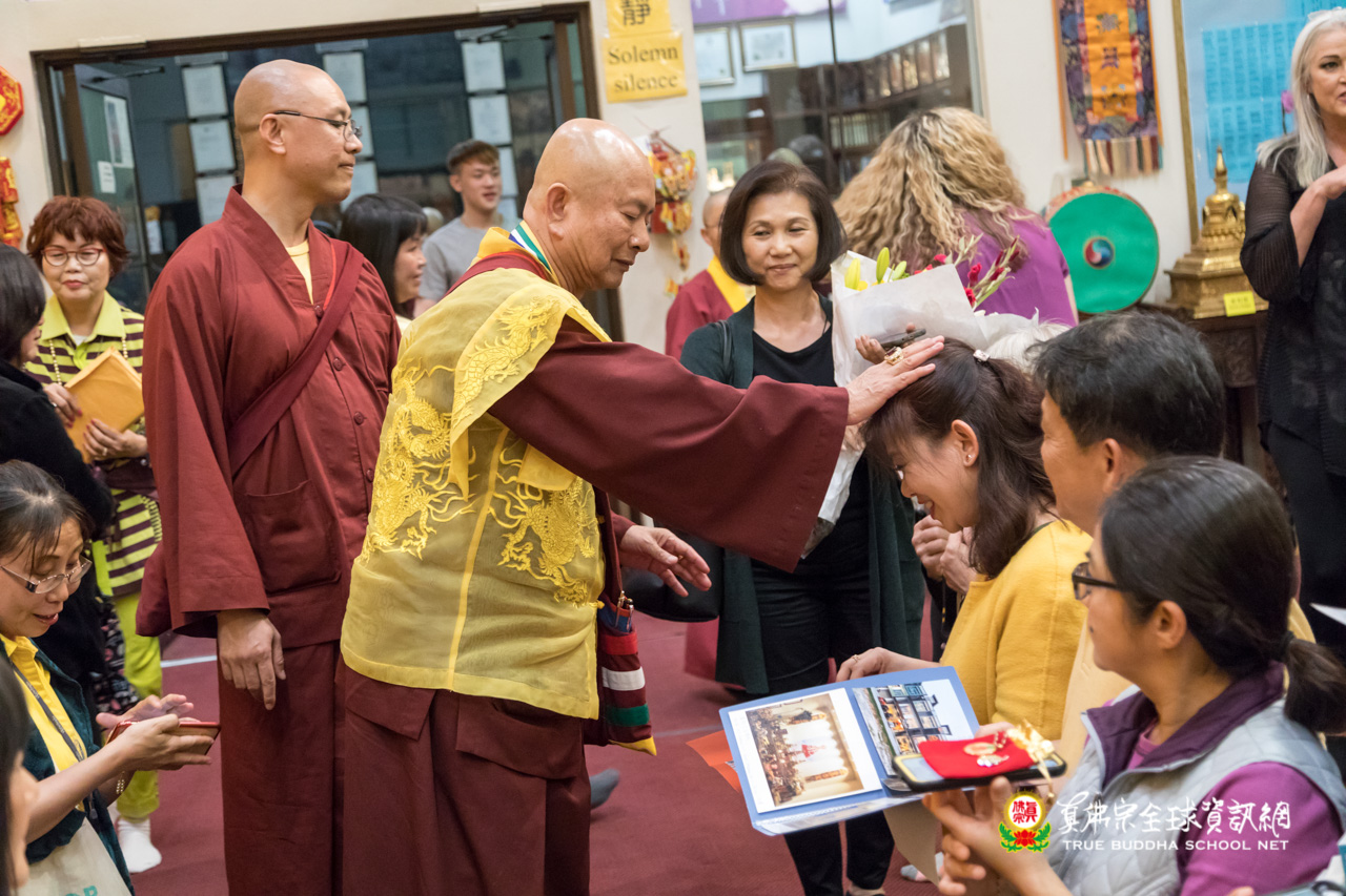 精采絕倫的開示後,聖尊為信眾賜授皈依灌頂、加持大悲咒水及開光佛像。會後,聖尊為大眾簽書,第二百七十二冊文集「淨光的撫摸」,人手一本新書,不但有根本上師的簽名加持,書中更有濃郁醇厚的法味滿滿。簽書結束後,聖尊慈悲的為大家摩頂加持。圓滿結束這充滿感恩的夜晚。