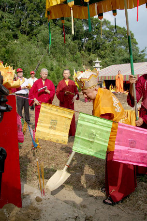 三義雷藏寺位於台灣苗栗縣大湖鄉,山腳下就是鯉魚潭,風景優美。10月11日下午3時,三義同修會蓮花童子護摩法會準時開始,常駐講師洪兆基、堂主李沛翎,首先恭請師尊蓮生活佛主持三義雷藏寺動土典禮,師尊從法座移駕雷藏寺預定地,灑鹽米結界,口誦:「良辰吉時發發發」,親自拿鏟子動土。師尊並說:「一切圓滿!」