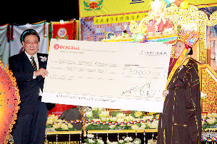 蓮簡金剛上師並代表圓證堂移交三萬元善款予新加坡腎臟基金會主席Mr. Gerald Ee,對方也頒發感謝狀予圓證堂。