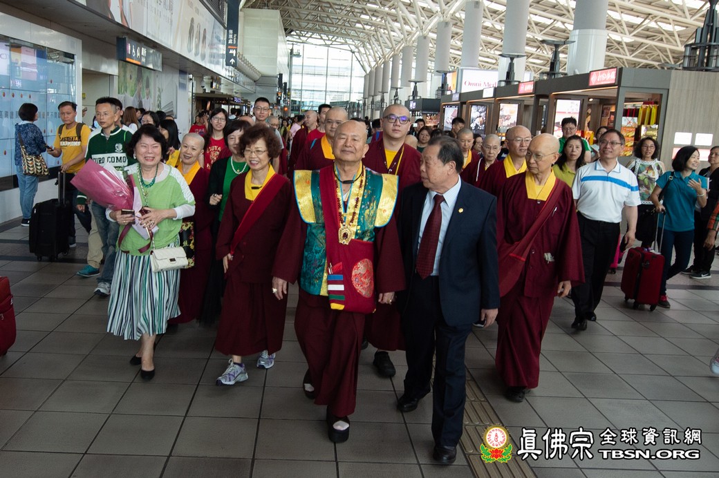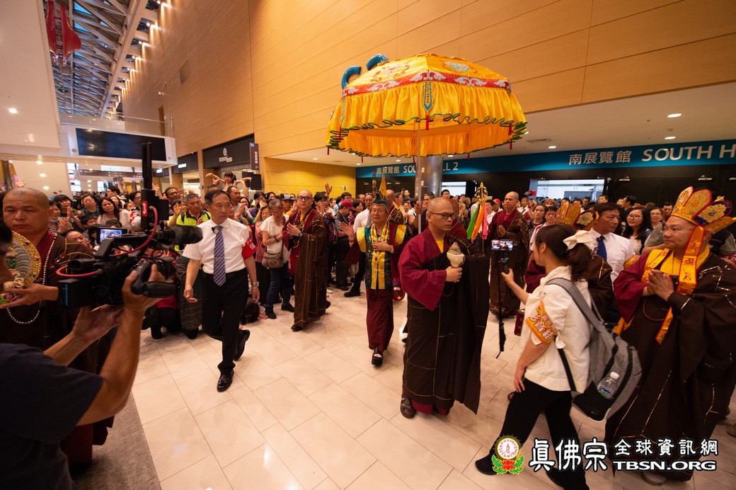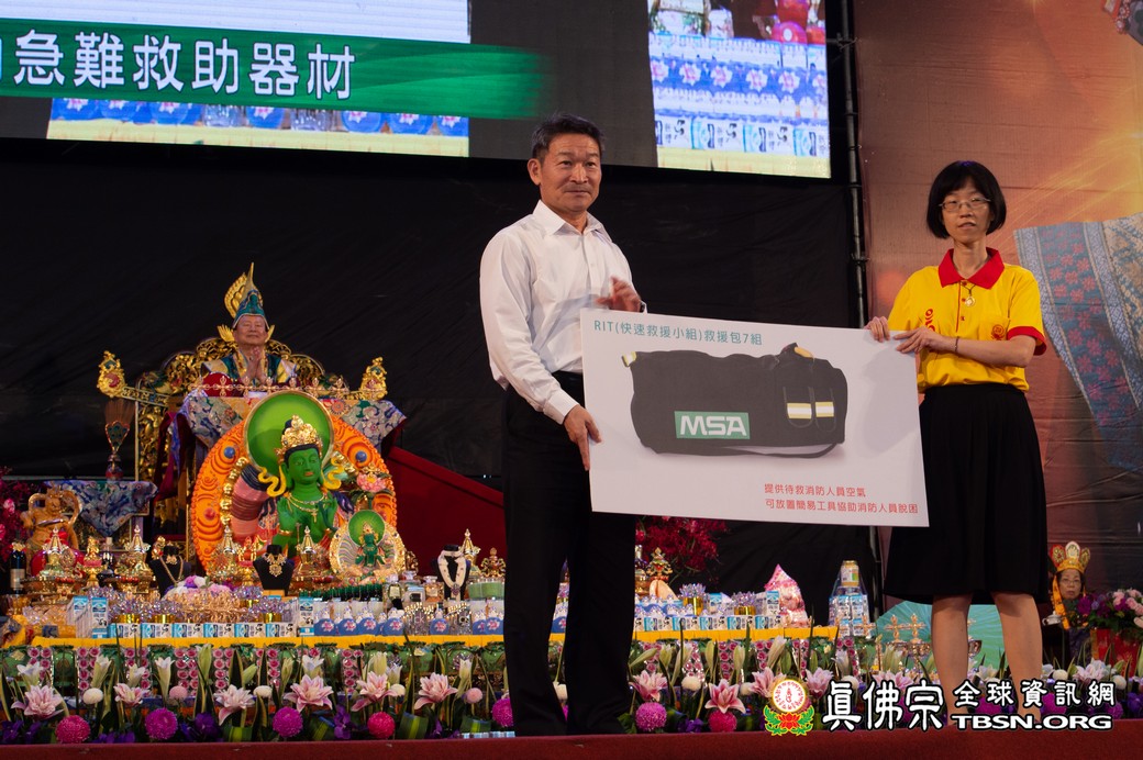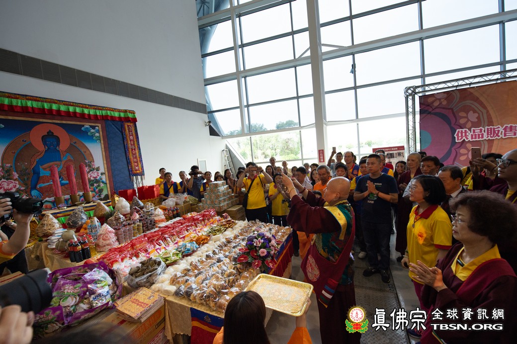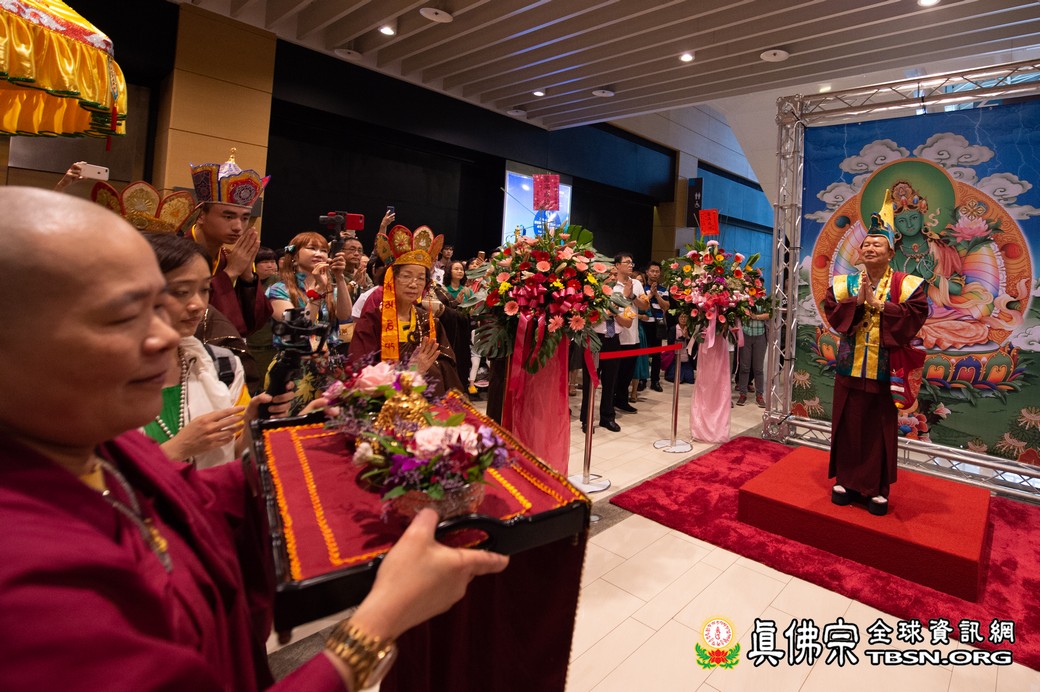 早在上午9點,四眾弟子便紛紛湧入會場。師尊、師母於10:50分抵達高雄展覽館,先加持了法會壇城、延生位、往生位及現場攤位,並持咒測試現場的音響設備;根本上師更自掏腰包,贊助了真佛般若藏和大義學會,如此實際的大賜福,令現場信眾無不感動。中午時分,功德主紛紛向師佛敬獻哈達,祈求救天災度母大悲心的加持,圓滿每一個善願。接著師尊接受了中天、民視等媒體的採訪;師佛講到自己與高雄的淵源,對此處有很深的眷戀,今日傳「救天災度母」法,就是要消除這片土地和台灣地、水、火、風的災難,真佛宗更熱心公益,「大義學會」為體恤打火兄弟的危險辛勞,特捐贈總價約台幣50萬的RIT(快速救援小組)救援包7組給高雄市政府消防局,黃江祥局長也回贈感謝狀,眾人皆期許「大義雷藏寺」速在高雄市矗立;記者們也問及現任高雄市長韓國瑜和蓮生法王的因緣,原來去年4月8日在高雄國際會議中心的「綠度母」傳法大法會,當時尚未成為市長候選人的國民黨高雄市黨部主委韓國瑜,就在法會上向蓮生活佛敬獻哈達,師尊感應到綠度母、二十一度母和咕嚕咕咧佛母給了他很大的加持,韓國瑜亦是相當努力與親民,能體恤百姓疾苦,自然俱足當選的善緣。