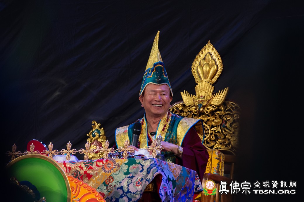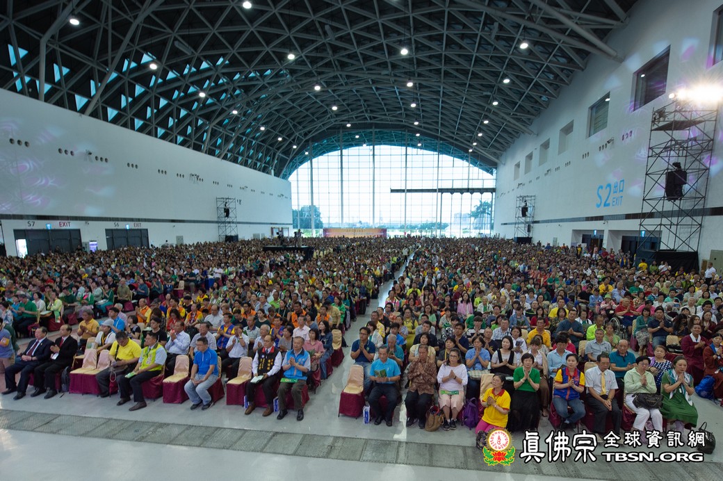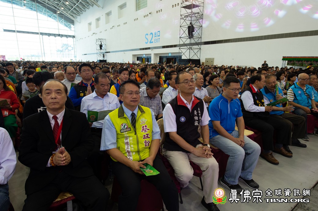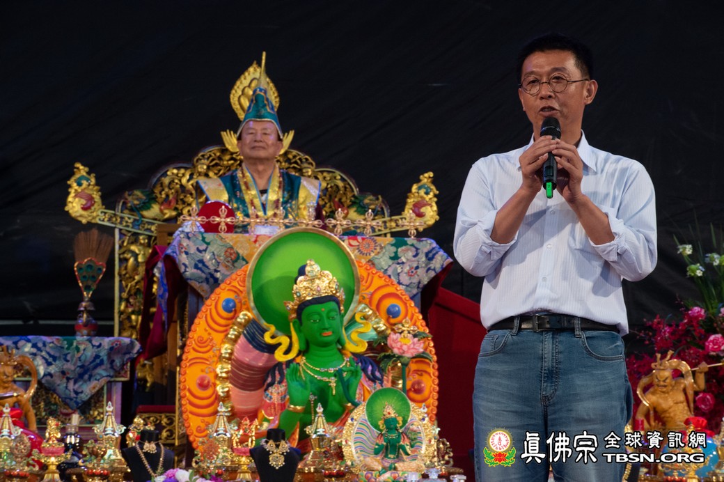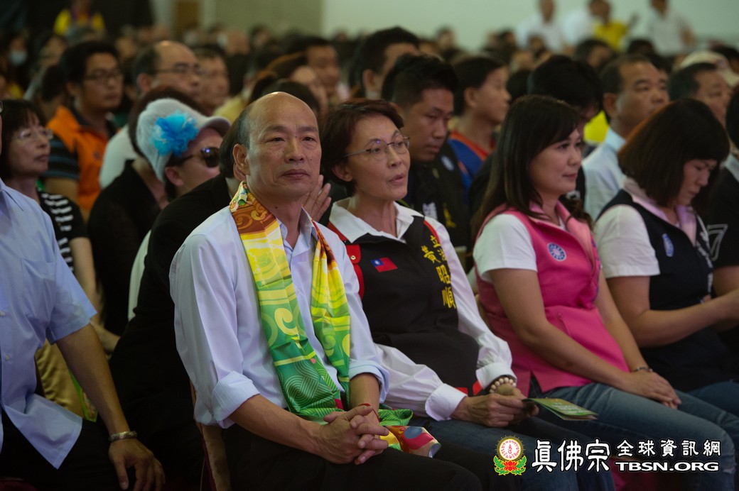 下午兩點,迎師組與上師團恭迎根本上師蓮生法王高昇法王座,主壇「救天災度母傳法大法會」。現場逾萬名善信與各界名流齊聚,將高雄展覽館偌大的會場擠得水洩不通。法會開始前,多位貴賓上台致詞;高雄市長韓國瑜偕同幕僚蒞臨,韓市長並上台致詞,他從事政治活動,絕不能忽略黎民百姓所遇的艱難,要時時保持一顆謙虛的心,有感於「世間苦人多」,感恩師尊主持這場佛教盛會,讓世人無比浮動的心能寧靜下來,遠離顛倒夢想,讓台灣社會和高雄,更和諧及美好。「高雄小金剛」許智傑立委講到和師尊結緣五六年,學到了歡喜做和歡喜心,便能一輩子快樂幸福。黃昭順立委也感謝師佛的基金會協助全球災後重建,八八風災後,更在高雄建橋、協助弱勢兒童,並讚嘆這場盛大的「救天災度母護國祈福大法會」,能讓台灣、高雄遠離災厄,風調雨順、國泰民安。
