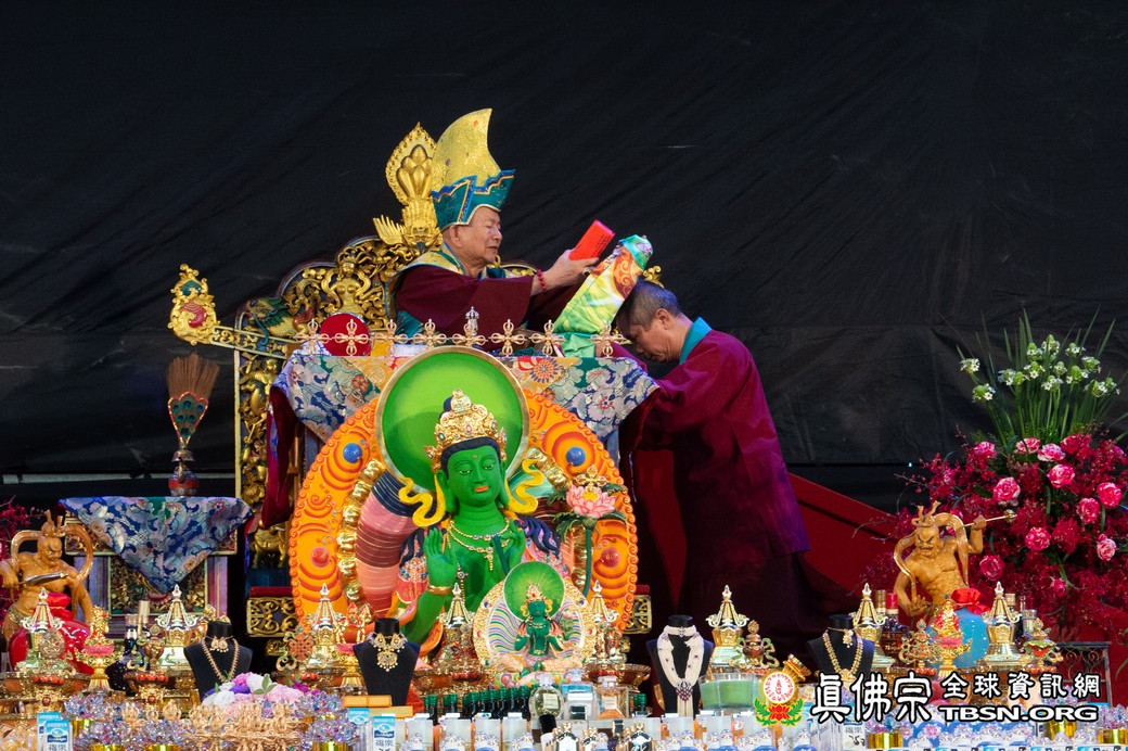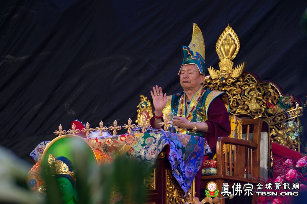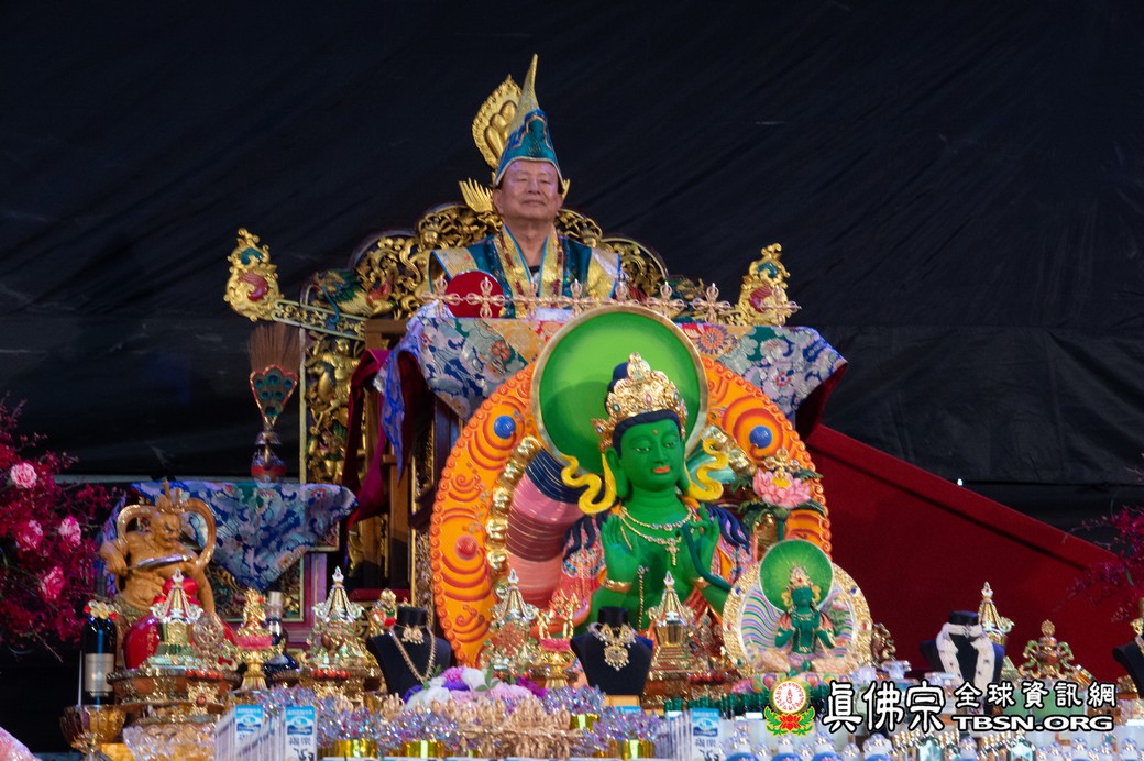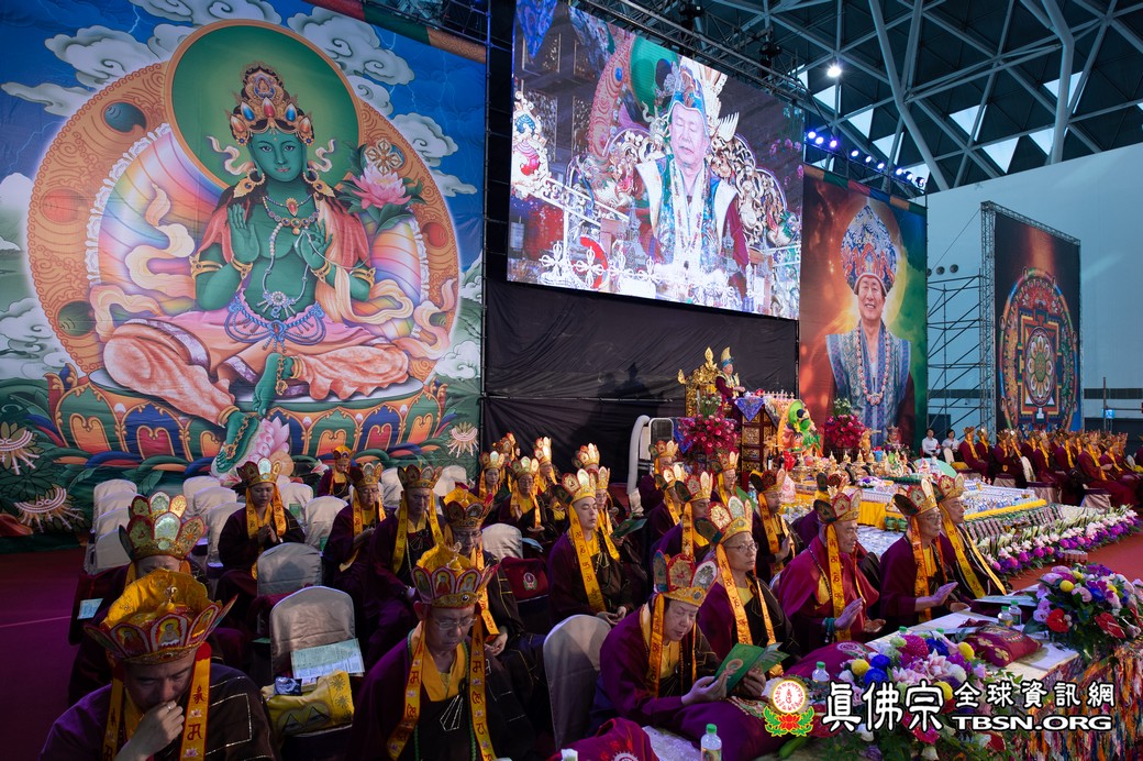 「救天災度母大法會」正式開始。會場銀幕播放著精緻的救天災度母三段法生觀想畫面,讓人人自然而然地在念頭中升起莊嚴法相,救天災度母心咒:「嗡。達咧。都達咧。都咧。媽媽沙爾哇。耶耶嘛哈。哈那巴雅。新登木。咕嚕。梭哈。」的優美咒音中,根本上師演化息災、增益、祈福、敬愛、超度大手印,清淨的法流灌頂著每位與會者!迴向時,蓮生法王祈請救天災度母接引幽冥眾往生佛國;消除大眾的業障、疾病、災難、煩惱和意外,人人福慧增長、敬愛圓滿、所求如願、修行得力、光明熾盛、心靈提升、果位增上;護佑這一片大地吉祥如意!