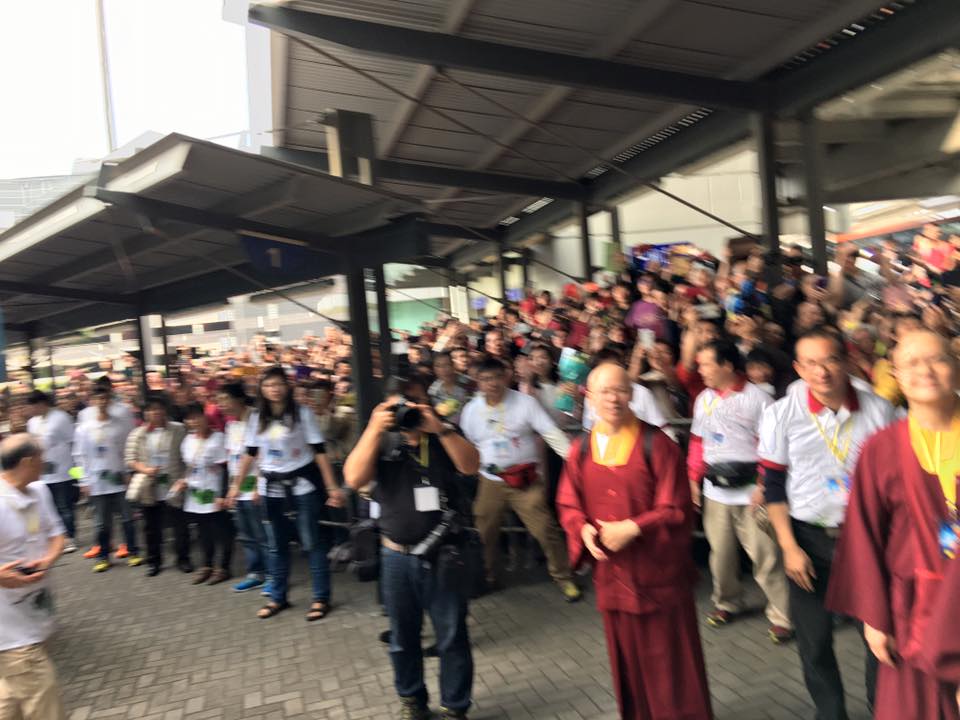 機場外,等待在外的無數的真佛弟子,一看到最想念的師尊,終於再度來到香港,大家難掩興奮之情,一時歡聲雷動,不斷地向師尊師母高喊「師尊師母好」、「「師尊師母我愛你」!