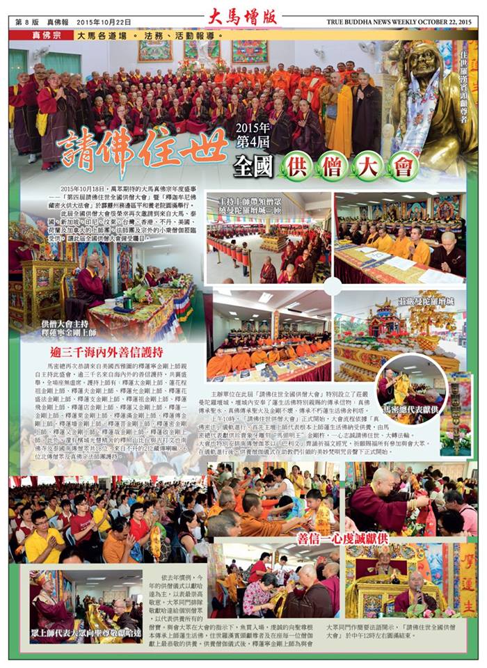 2015年10月18日在真佛宗大馬密總的籌辦之下,第四屆「馬來西亞全國供僧大會」暨「請佛住世.釋迦牟尼佛護摩大法會」在馬來西亞霹靂州務邊區的真佛宗「平和老人院」盛大舉行。