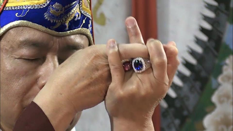 接著談到今日護摩主尊「穢跡金剛」 在東密是很有名的,蓮生活佛曾經接受紐約「金剛雷藏寺」的邀請,於麥廸森廣場主持「穢跡金剛」法會,當時傳授「穢跡金剛」法講得很清楚。能夠在麥迪森廣場 做法會,可以說是一生的榮耀,老外也會很尊敬。 蓮生法王示範「穢跡金剛」手印,親誦短咒:「嗡。俱嚕。馱曩。吽。惹。」,種子字是「吽」字。