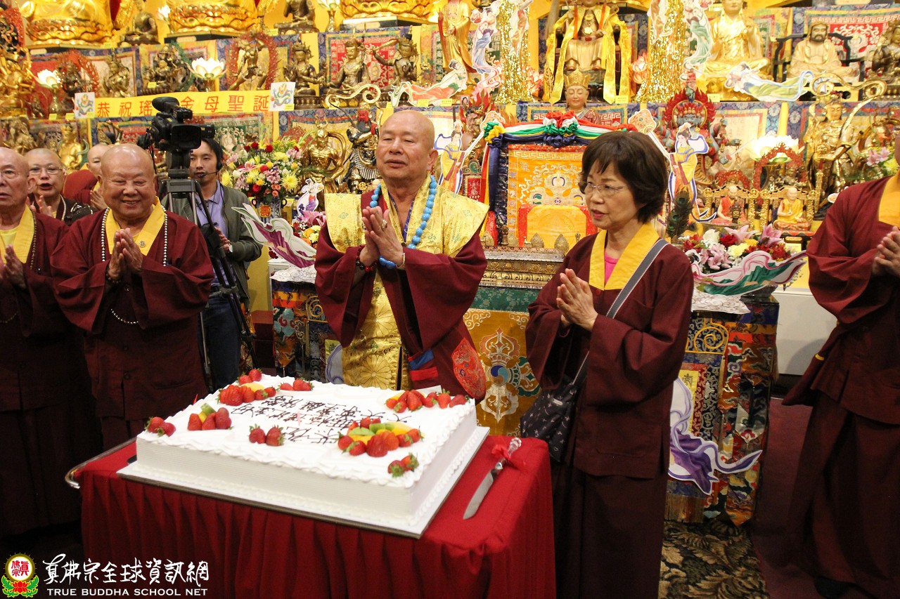 在師尊結束精彩法語開示後,為多位信衆賜授皈依灌頂,並加持大悲咒水及開光佛像。西雅圖雷藏寺準備了金母生日大蛋糕,師尊師母與大衆合唱生日歌,然後師尊慈悲ㄧㄧ為每位善信摩頂,大衆也分得壽桃、壽包、滿載而歸,個個都法喜充滿。非常感恩聖尊的諄諄教誨,讓大家受益良多,感恩師尊!
