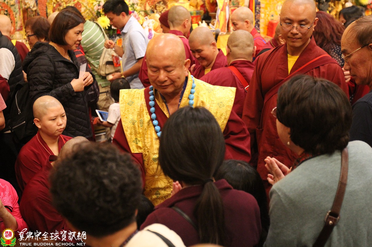 由於再一個禮拜就是秋季大法會,所以世界各地的同門、善信大德,紛紛前來聚會、禮佛、朝拜師尊,擠得大殿都是滿滿的人潮。八點整,莊嚴的迎師隊伍從密苑迎請尊貴的師尊到大雄寶殿,全體弟子胡跪合掌,虔誠恭請根本上師聖尊蓮生活佛前來主壇同修及慶賀瑶池金母聖誕。