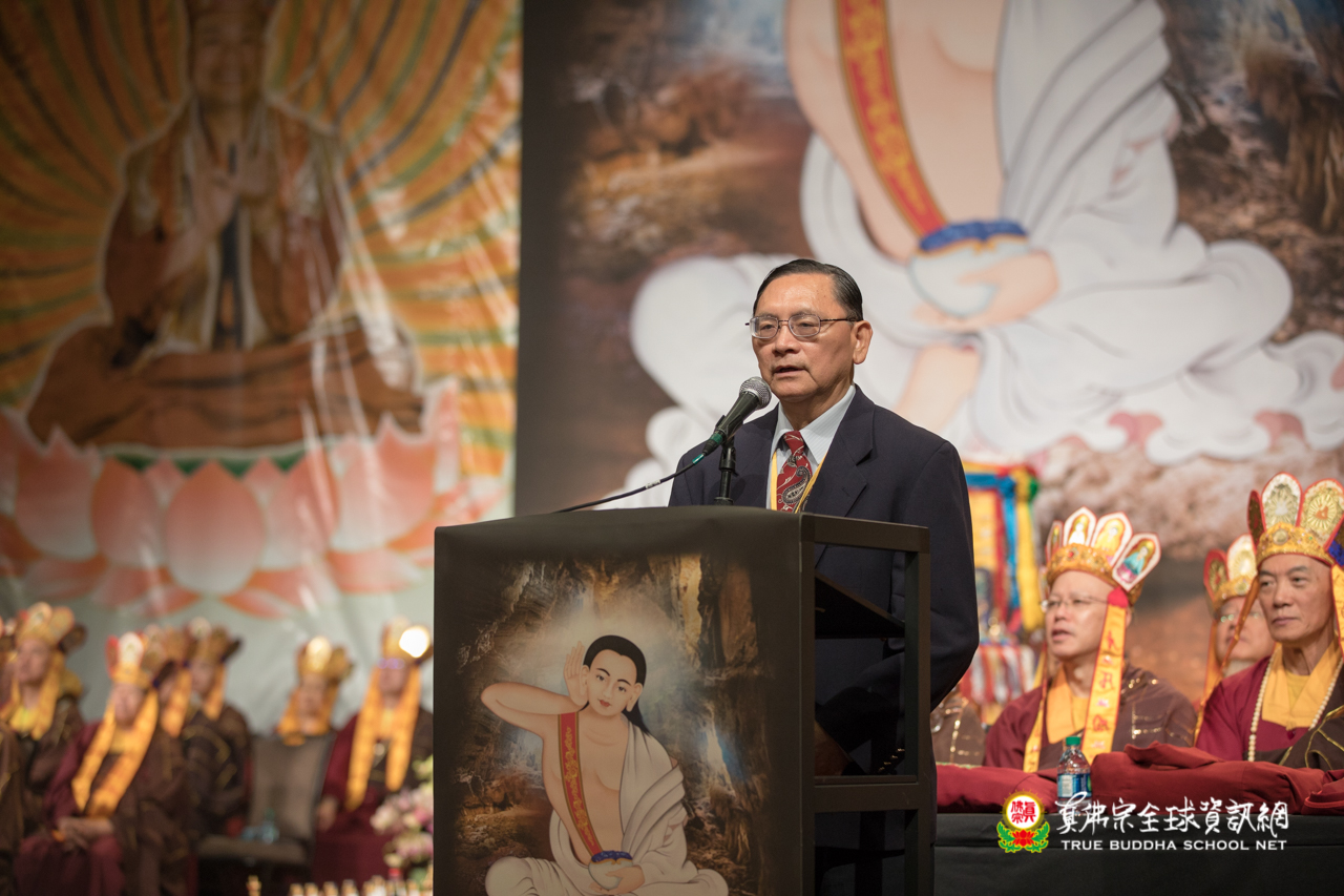 接著,中研院院士朱時宜教授致詞,首先感謝無上尊貴的聖尊蓮生法王傳受殊勝無比的密勒日巴尊者本尊法大法。他談到,本次的傳法主尊密勒日巴是在十一世紀,大約在宋朝的時代,是西藏最偉大傳奇的瑜伽士,他也是哲學家和詩人,也是藏傳佛教最受尊崇的尊者。密勒日巴尊者的成就,對現代的科學家也有重大的啟示,在追求宇宙的真理,無論是從宗教或科學的角度出發,都需要有堅毅的信心。在面臨巨大的困難時還能保持信心。只要真佛弟子都能全心全意地真正的敬師、重法、實修,終有一天大家都能夠得到成就。