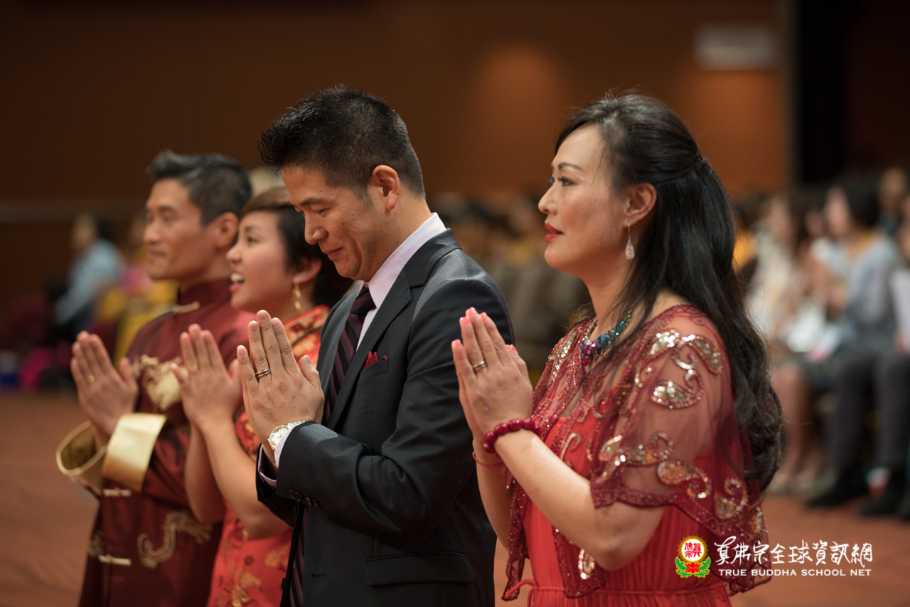 聖尊接著為三對新人做福證,聖尊問新人們是不是愛對方,三對新人齊喊「是!」聖尊說,在一問一答間便是結婚,現場氣氛一片歡樂。聖尊祝福新人能夠白頭偕老、百子千孫、幸福美滿。在本師釋迦牟尼佛的聖號中,新人合飲加持的淨水及交換禮物,禮成圓滿。