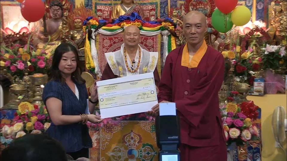 同修後,首先由「西雅圖雷藏寺」代表釋蓮旺上師,向蓮生活佛敬獻哈達及供養,祝賀師佛生日快樂;接著由〈宗委會〉捐贈「尼泊爾」賑災善款4萬多美金給「盧勝彥佈施基金會」,以及「華光功德會」蓮慈上師代表捐贈善款,協助「盧勝彥佈施基金會」幫助教育及健康醫療照顧,並由總裁盧佛青博士接受。