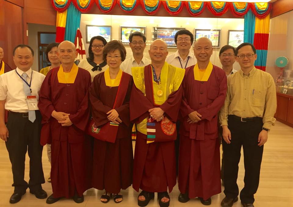 蓮生活佛於大殿上香後,隨即與教育界學者丶博士教授團合影後,即上六樓加持信件,處理宗務。