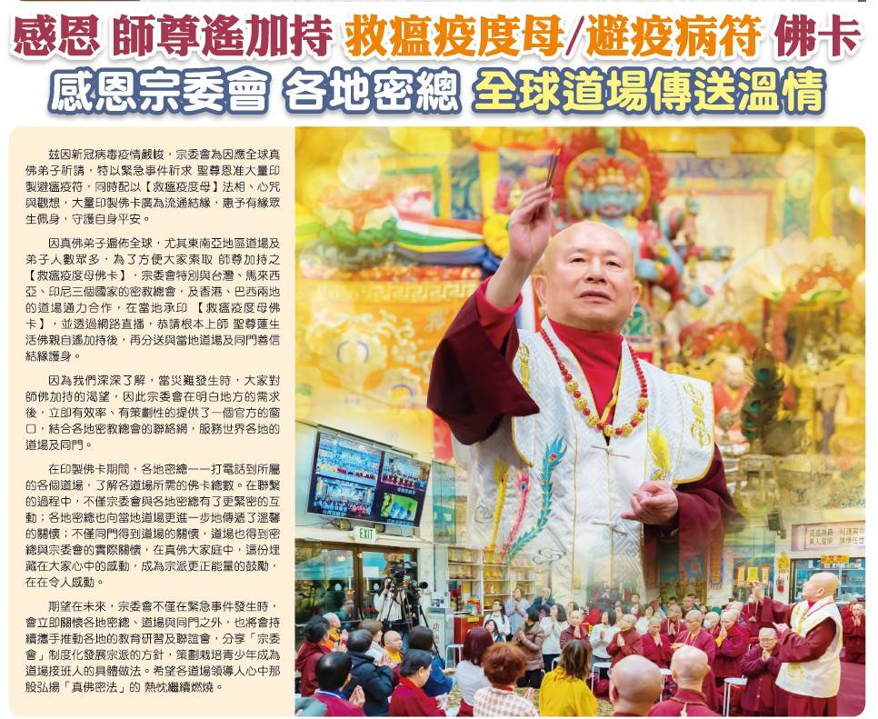 玆因新冠病毒疫情嚴峻,宗委會為因應全球真佛弟子祈請,特以緊急事件祈求 聖尊恩准大量印製避瘟疫符,同時配以【除瘟疫度母】法相、心咒與觀想,大量印製佛卡廣為流通結緣,惠予有緣眾生佩身,守護自身平安。