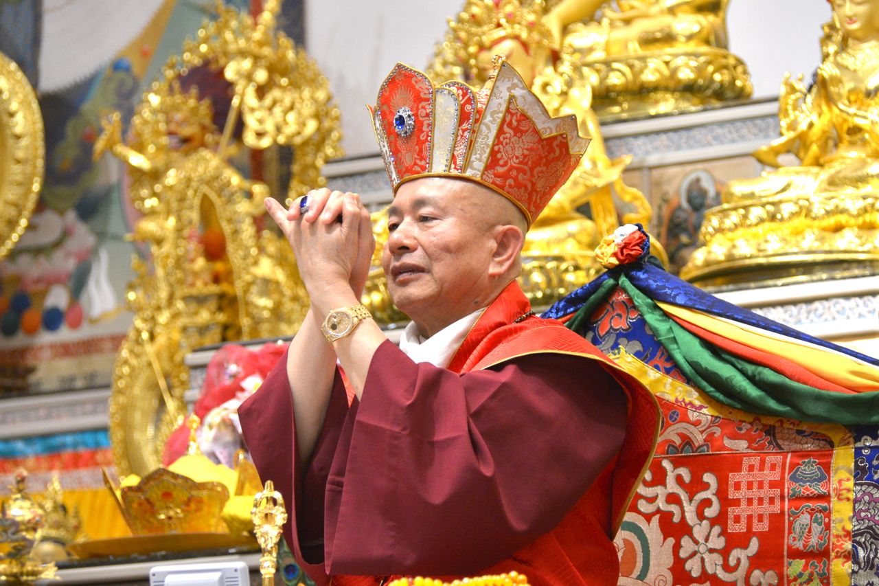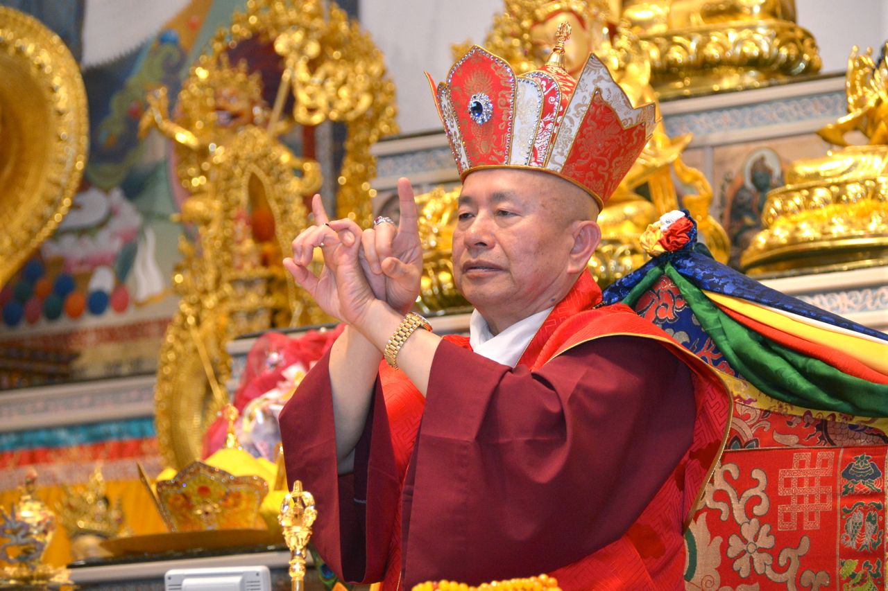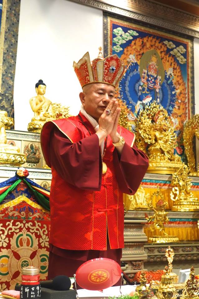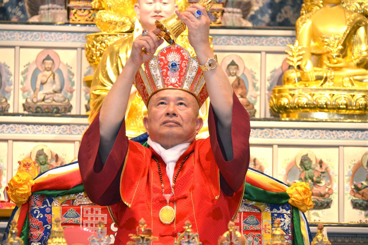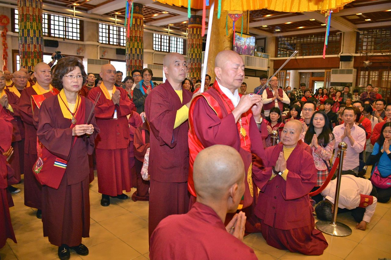 2015年2月21日蓮生活佛 盧勝彥法王新春大年初三主持「紅財神護摩法會」。法會前,首先宣佈由常智上師推薦回信中心的蓮舅法師為金剛阿闍黎。