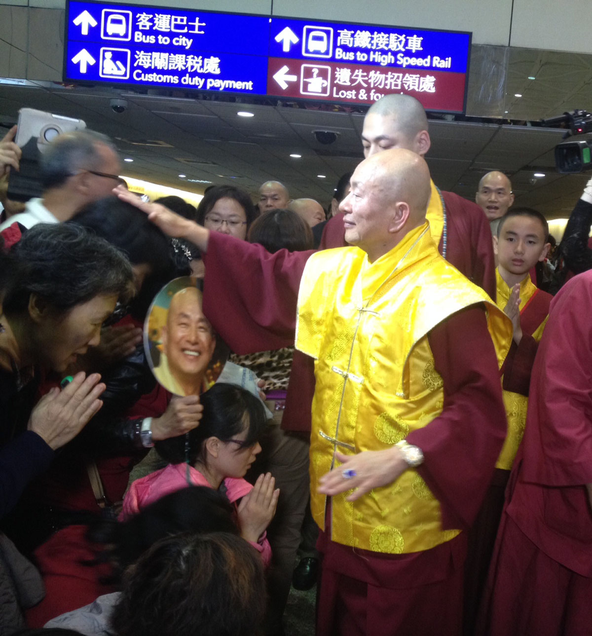 2014年11月16日蓮生活佛 盧勝彥返台弘法,逾千善信擠爆「桃園國際機場」,接機場面浩大