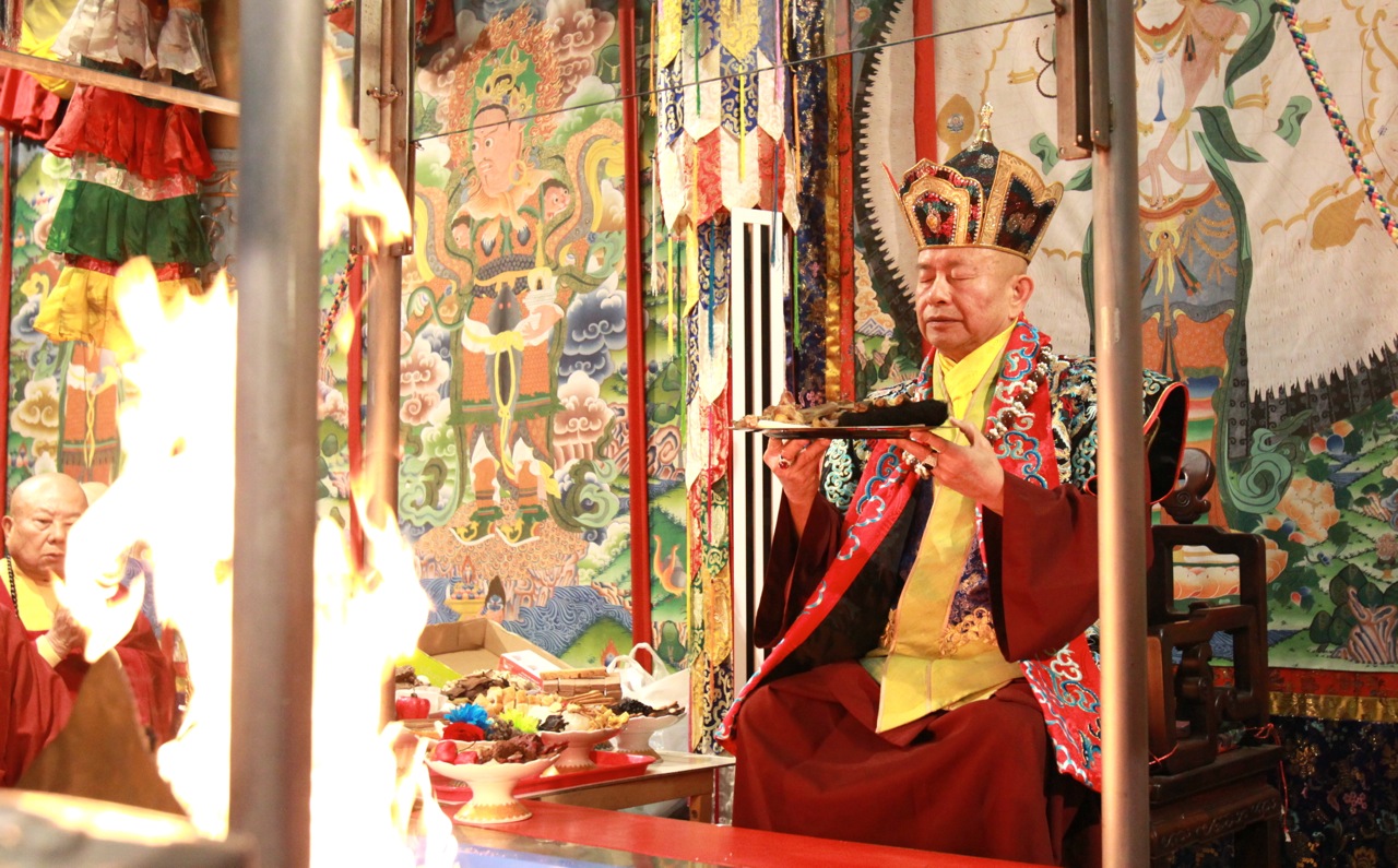 護摩後,蓮生活佛介紹今日護摩主尊「瑪哈嘎拉」,開示道:「瑪哈嘎拉」譯為「大黑天」,有二臂、四臂、六臂,「二臂大黑天」為白教噶瑪噶舉之事業護法,呈現忿怒兇相乃降伏自身心魔,象徵無畏。大黑天最重要的特徵是兩條腿下跨在一頭仰臥的白象身上,白象左手拿著髑髏碗,右手拿著大蘿蔔。