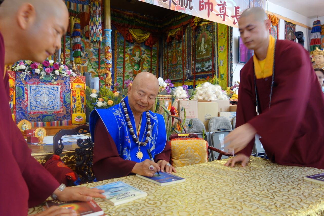 8月24日上午十點半,蓮生活佛 盧勝彥應廣大書迷在〈彩虹雷藏寺〉簽英文書。