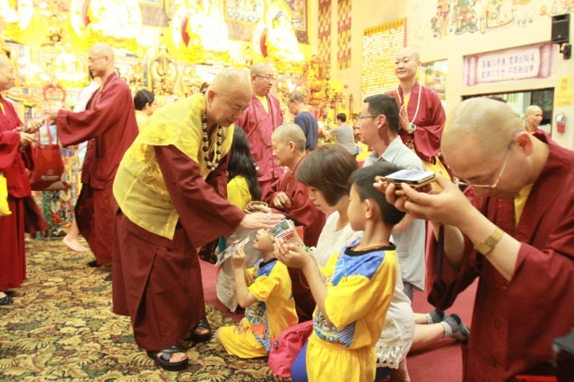 開示完,大眾抱以熱烈掌聲,感恩蓮生法王的寶貴開示,最後,蓮生活佛 盧勝彥法王與大眾同唱佛號,並慈悲賜授「皈依灌頂」、加持「大悲咒水」及佛像文物加持「開光」,同修活動在蓮生法王一一為眾弟子們摩頂加持中,圓滿吉祥。