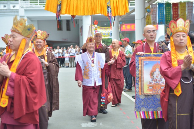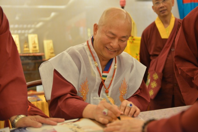 由於簽書、獻哈達、求加持的人潮眾多,下午四時許,法會才正式開始。法會開始時,首先由 釋蓮伃金剛上師代表敬獻哈達,以表最高敬意。
