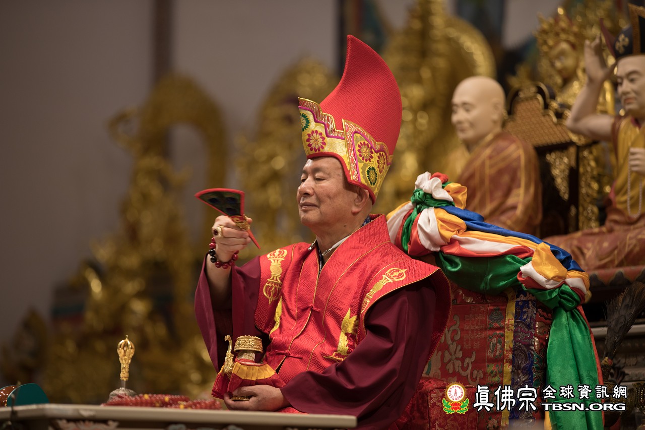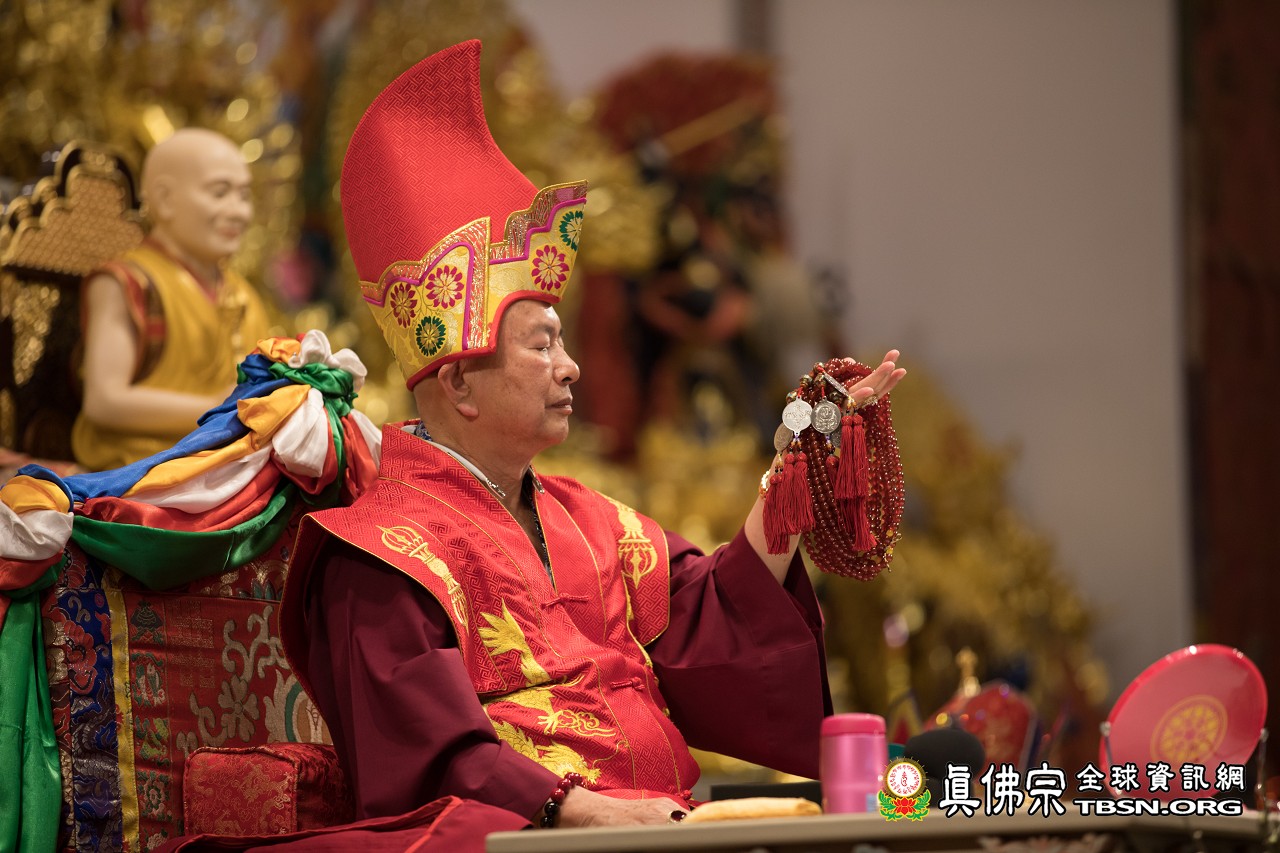 「行者絕不可放棄自己修行的本尊」,法王再度叮囑,「一日要憶念三次,當衪知道你想念衪,衪一定會跟你相應」。最後,法王慈悲賜授殊勝「咕嚕咕咧佛母不共大法、十方射箭法」灌頂,法會圓滿吉祥,紅光遍佈十法界。