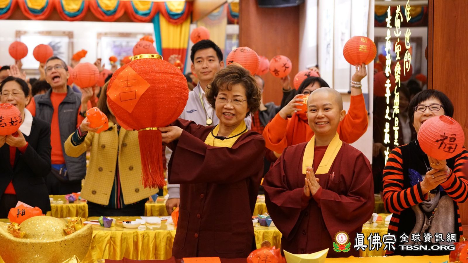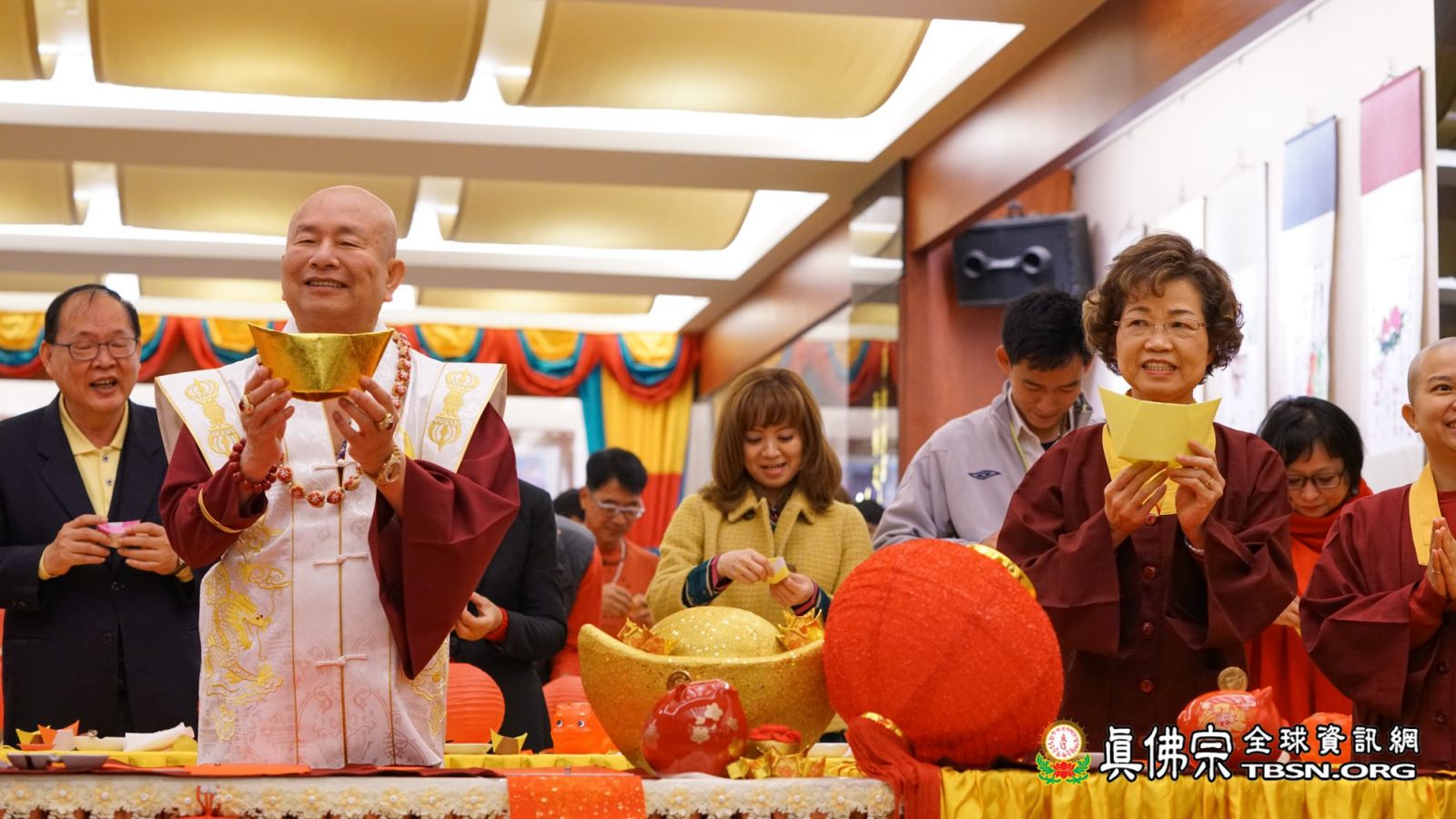 十一時許,法王蓮生活佛和師母蓮香金剛上師抵達台灣雷藏寺;弟子們見到了久違的師母,且精神飽滿地和師尊進行新春活動,諸弟子無不為她感到歡喜。師尊、師母先和大眾一起摺金元寶,願「金豬報喜!豬年吉祥!」而依師尊之前的開示,今年「接財神」要準備紅豬撲滿,主辦單位也準備了許多紅豬,及喜氣的紅燈籠讓大家題字;師佛先題了「滿」,象徵大眾「富貴滿滿,錢包滿滿」,再把「福」字倒貼在紅燈籠上,表示「福到了」!師母則在紅豬上題了個「祥」字,在紅燈籠上題了「吉」,呼應新年的「吉祥如意」!師尊和師母也跟大家一齊捧著紅豬和紅燈籠,喊道:「迎金豬,招財運,平安健康一整年!」令初一的台灣雷藏寺更顯得喜氣洋洋。