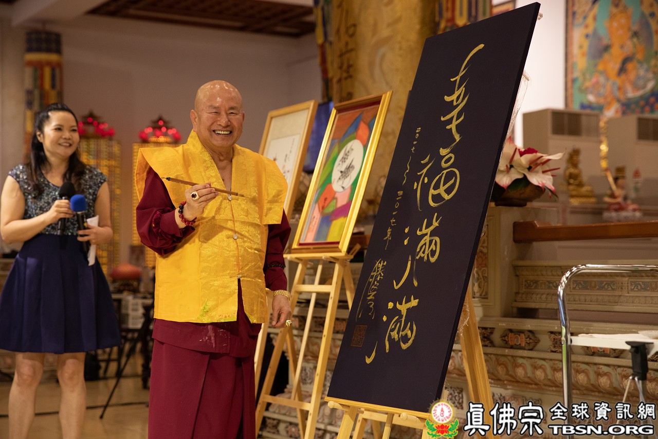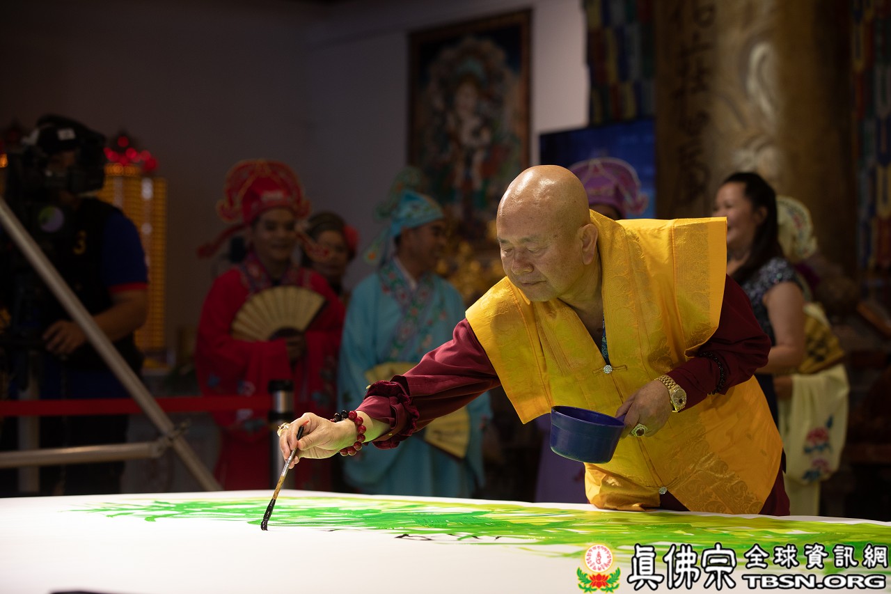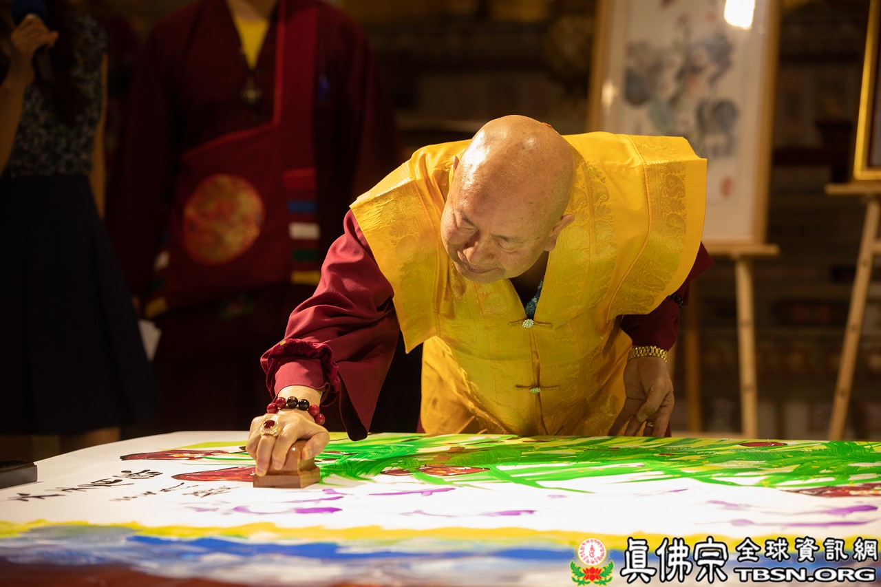 此次法王作家創作有別於前,首次嚐試以壓克力顏料方式揮灑彩墨,主辦單位大燈文化現場搭配鋼琴、古箏音樂演奏及天女獻舞,使會場充滿文藝氣息,同時穿插江南四大才子劇情演出,幽默逗趣。與會信眾盡情觀賞法王神來之筆,自然天成。
