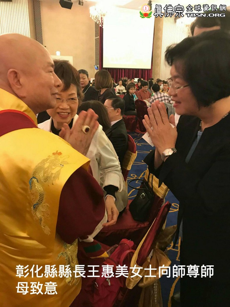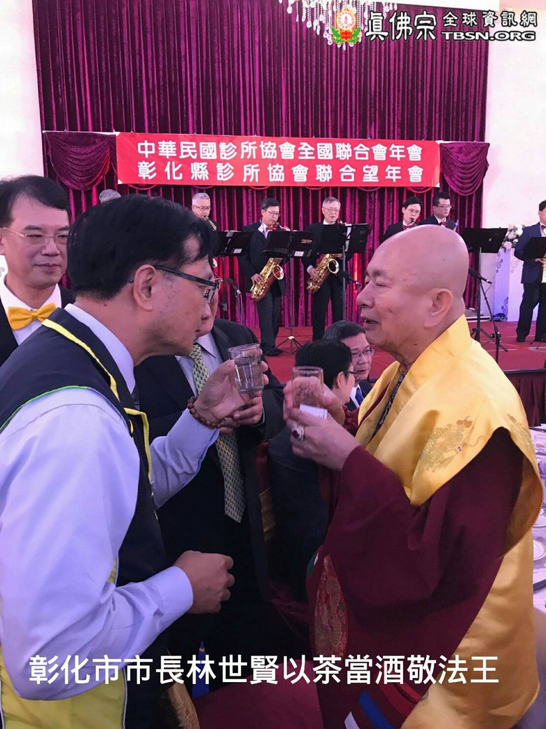 是日盛會,廖理事長很恭敬地請師尊師母坐上主桌,與眾有名的大醫院院長們同席。現場有很多第一次見到師尊的醫師們,紛紛趨前問候,向師尊討名片,合影拍照,令師佛一時之間,發完自己所帶來的所有名片。眾人還絡繹不絕地前來問候致意,連師母也翻開自己皮夾,終於找到一張師尊名片,遞呈師尊送給來者,對方才滿心歡喜離開。可見師尊即使蒞臨宗外場合,真佛魅力十足,仍然十分吸引眾人目光,然而,師尊並不會高踞自傲,反而更親切待人,真佛身教言教,高山仰止,真是眾生之垂範。