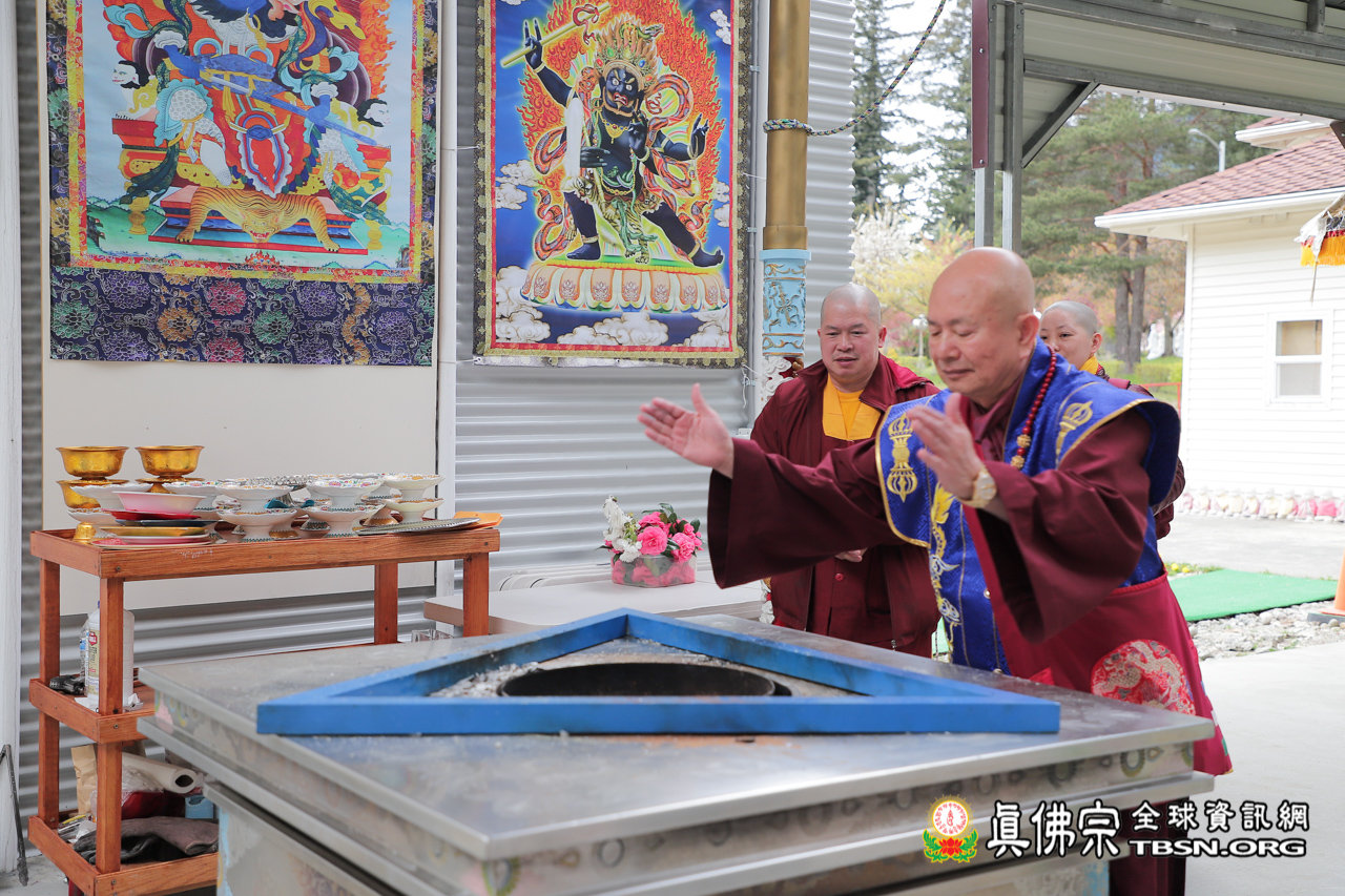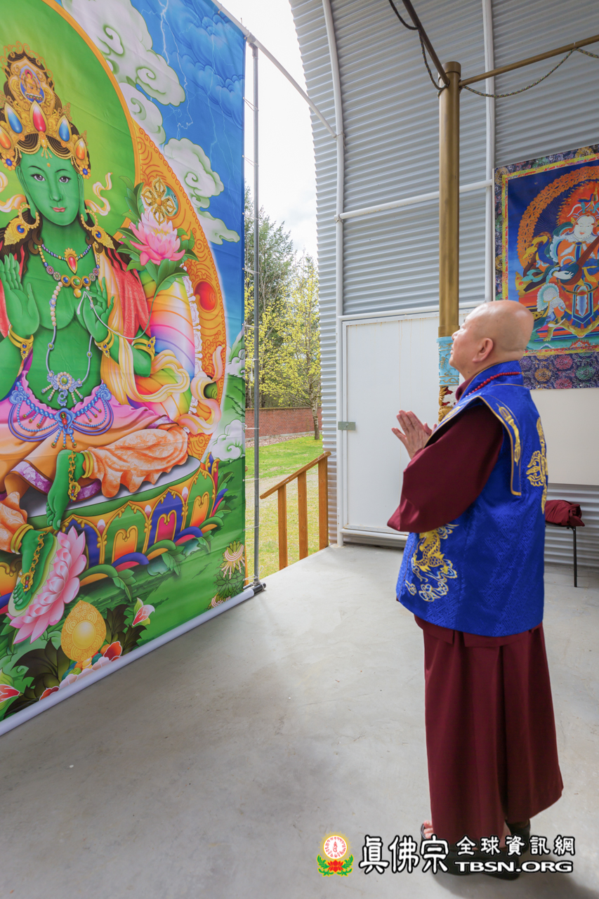 2020年4月19日下午,美國真佛宗西雅圖彩虹雷藏寺恭請根本上師蓮生活佛主壇救天災度母護摩大法會。法王於2019年4月28日應台灣南部大義學會之邀請,假高雄展覽館主壇「救天災度母護國祈福大法會」暨首傳及賜授「救天災度母不共大法」灌頂祈救天災度母能慈悲守護行者、護佑台灣,風調雨順、國泰民安。救天災度母身綠色,右手結「無畏施手印」,左手持著烏巴拉花,花上有十字金剛杵,表示降伏一切魔怨及障礙,但凡金剛杵淨光所照之處,能化解地、水、火、風等災難,使大地國土清淨光明。其外相為右足伸展,左足內踡,其意義是:右足伸展則表示其具大慈悲心,不離三界去救護眾生;而左足內踡則表示其住於智慧之空性當中,坐蓮花座。身飾天衣,種種寶飾,背有月光。頂飾阿彌陀佛,為密教二十一度母之一。