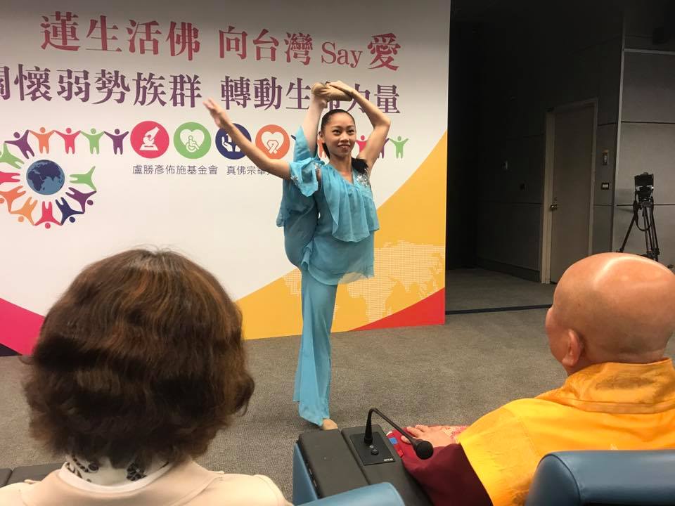 由於蓮花奬學金讓「蔡同學」得到總統教育獎,也藉由今天的記者會表演精彩絶倫的扯鈴表演供養師尊。