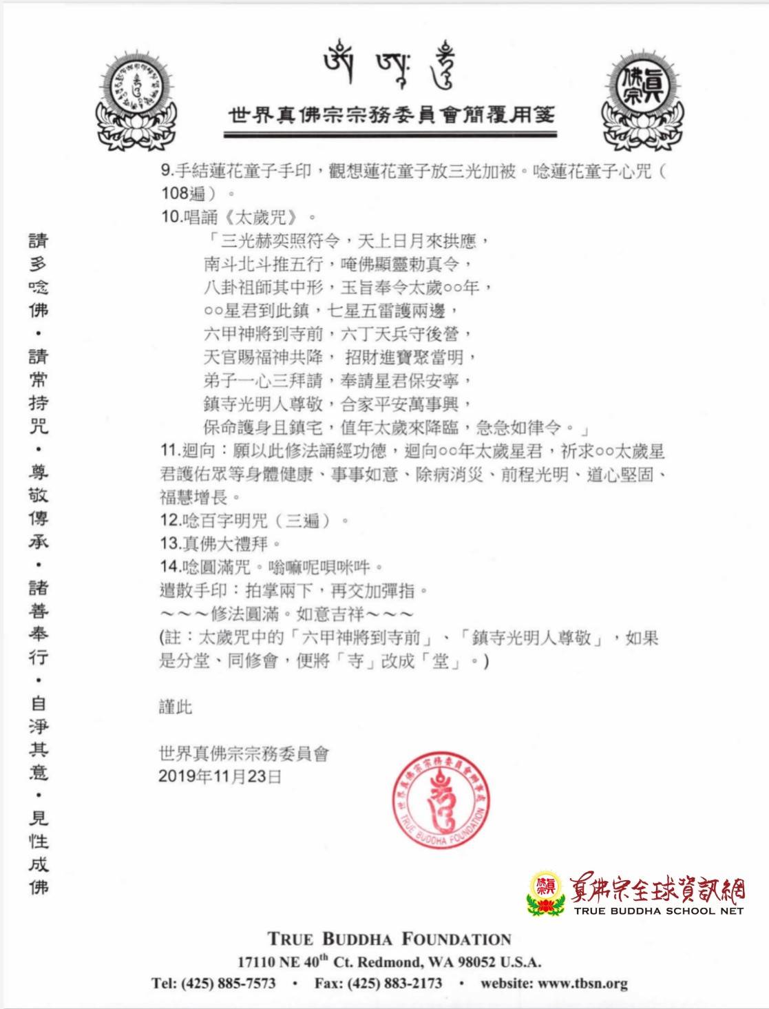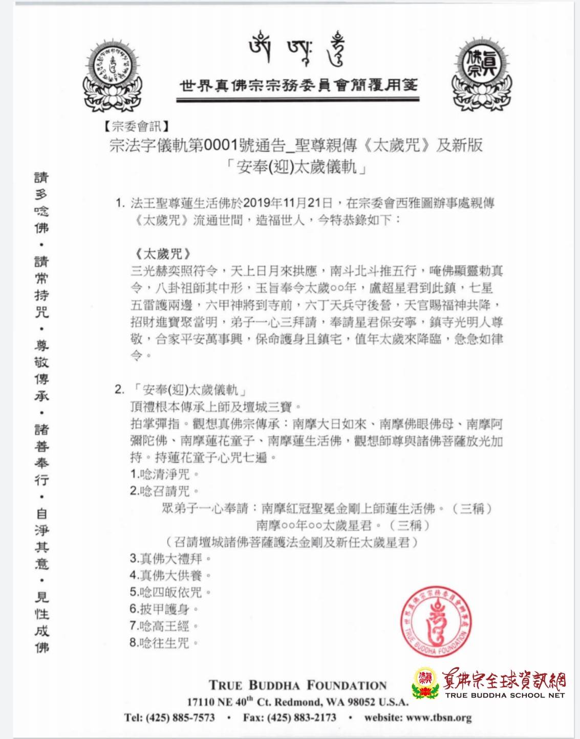 法王聖尊蓮生活佛於2019年11月21日,在宗委會西雅圖辦事處親傳《太歲咒》流通世間,造福世人,今特恭錄如下: