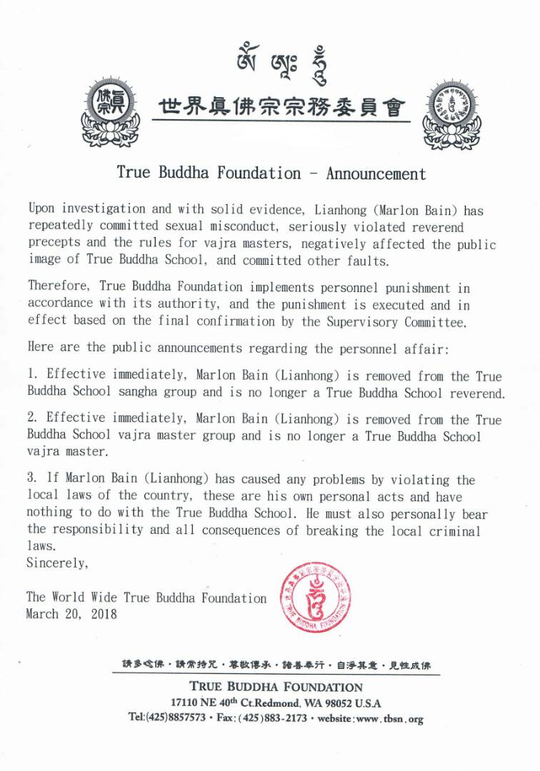 With immediate effect, MARLON BAIN (LIAN HONG) is removed from the True Buddha School sangha group and vajra master group and is no longer a True Buddha School reverend nor True Buddha School vajra master.