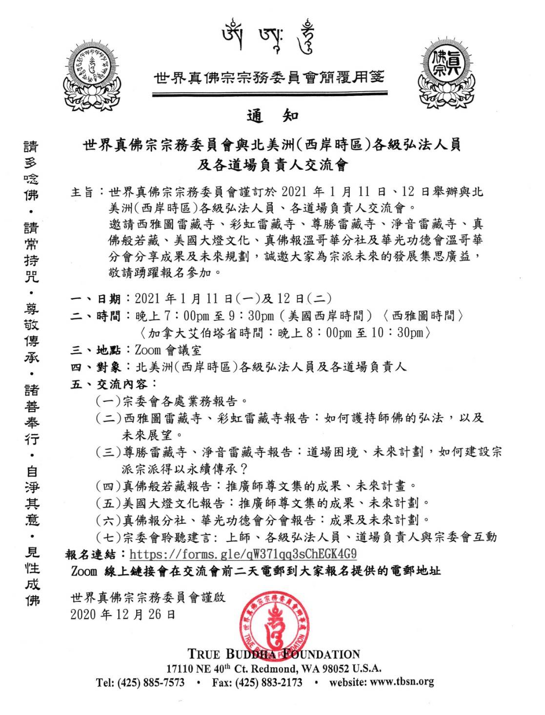 主旨:世界真佛宗宗務委員會謹訂於2021年1月11日、12日舉辦與北美洲(西岸時區)各級弘法人員、各道場負責人交流會。
