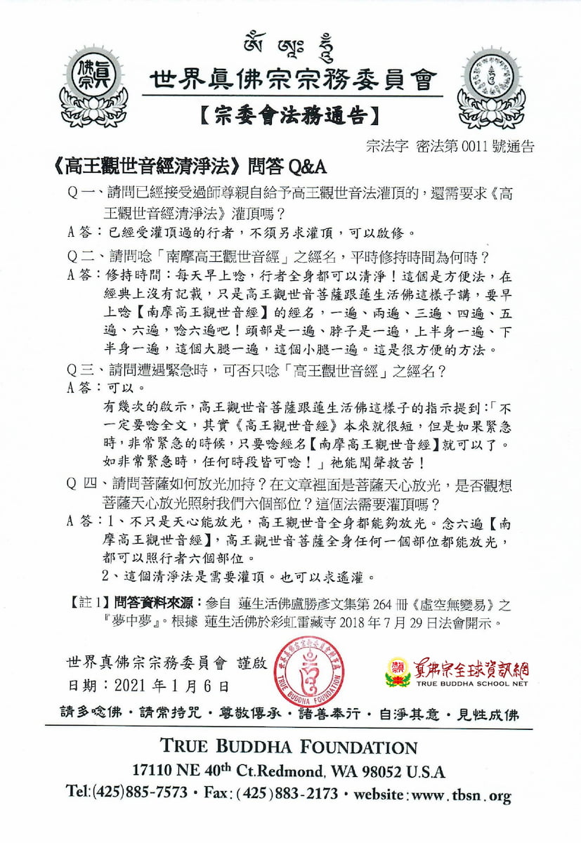 Q一、請問已經接受過師尊親自給予高王觀世音法灌頂的,還需要求《高王觀世音經清淨法》灌頂嗎?