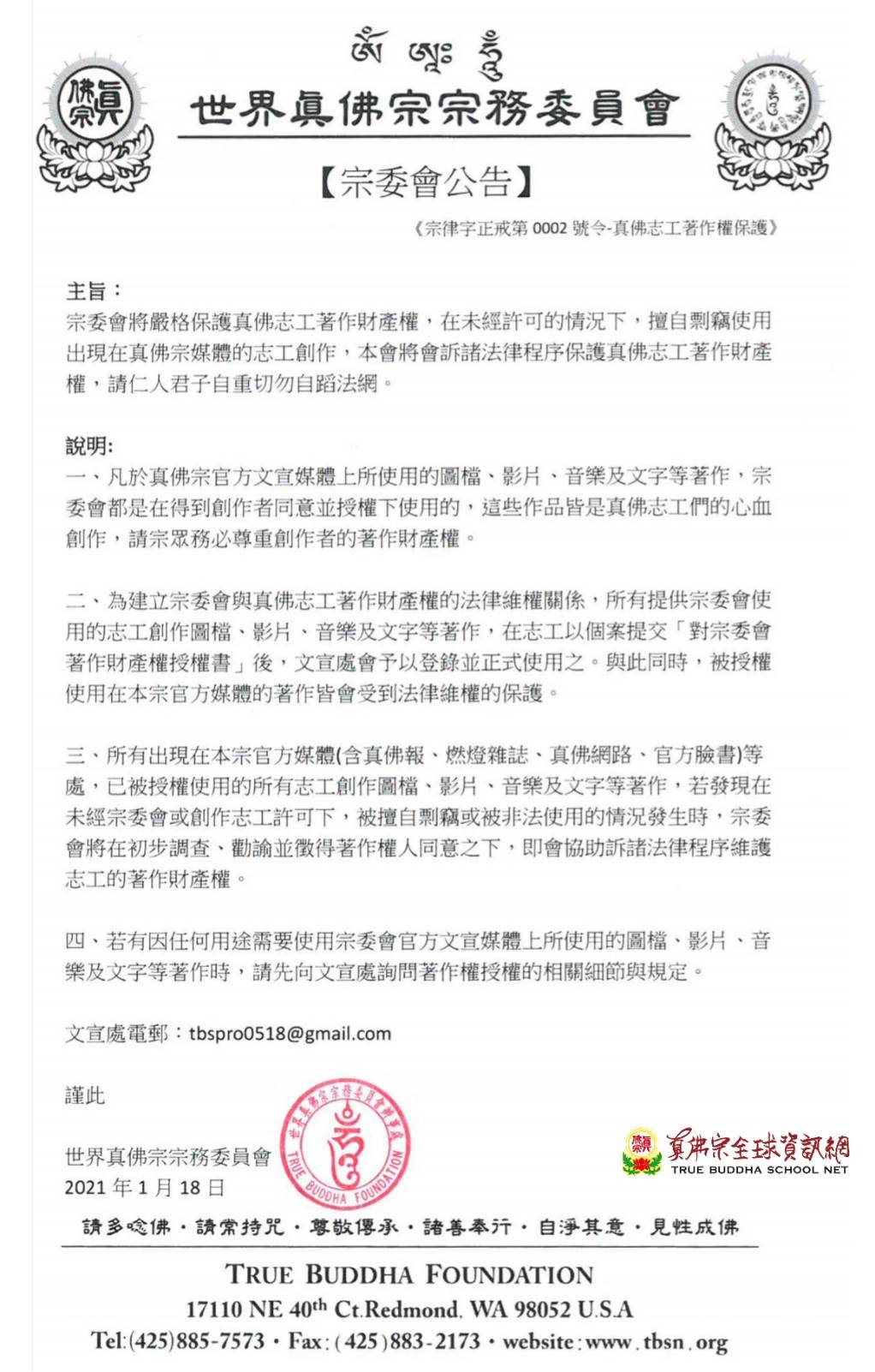 所有出現在本宗官方媒體(含真佛報、燃燈雜誌、真佛網路、官方臉書)等處,已被授權使用的所有志工創作圖檔、影片、音樂及文字等著作,若發現在未經宗委會或創作志工許可下,被擅自剽竊或被非法使用的情況發生時,宗委會將在初步調查、勸諭並徵得著作權人同意之下,即會協助訴諸法律程序維護志工的著作財產權。