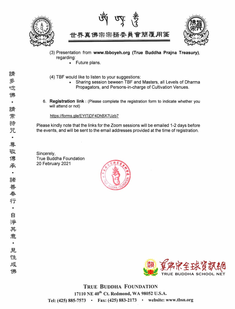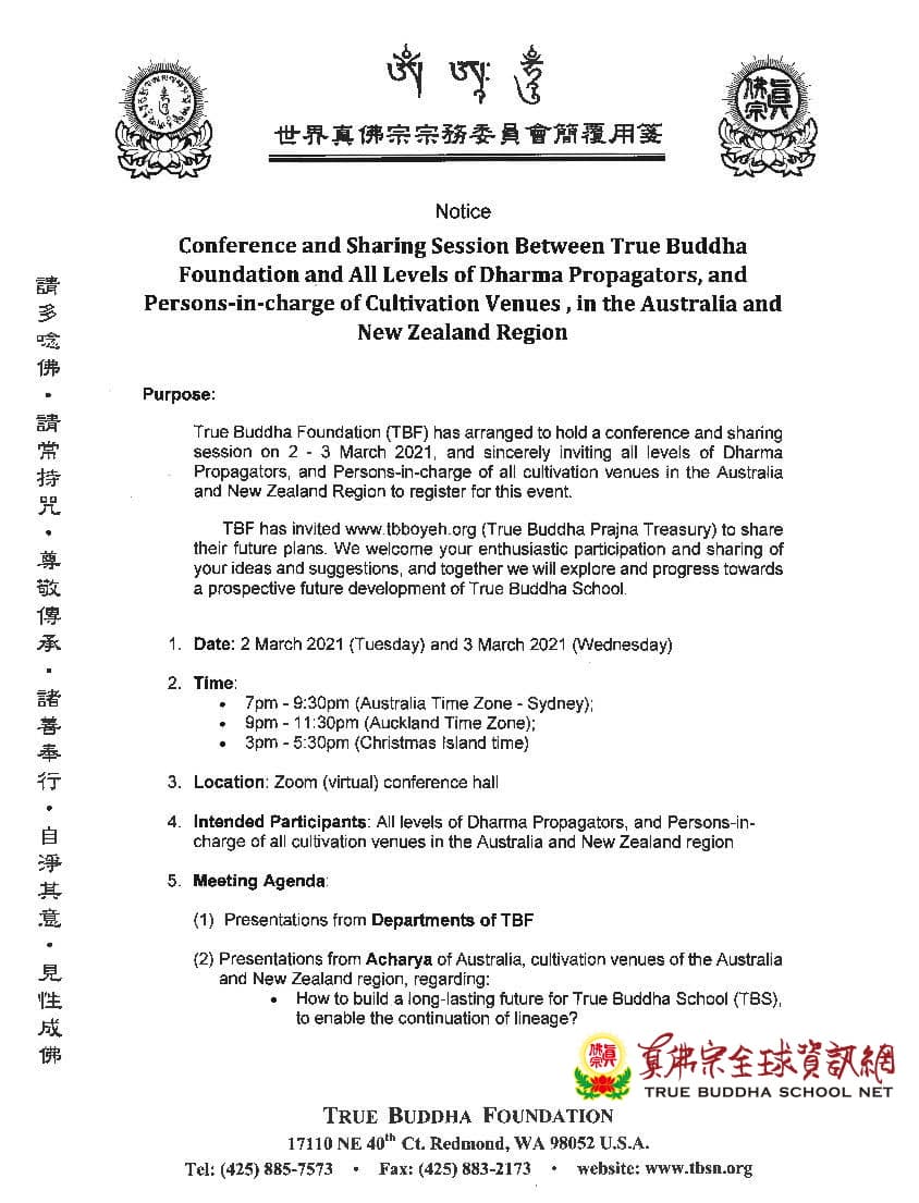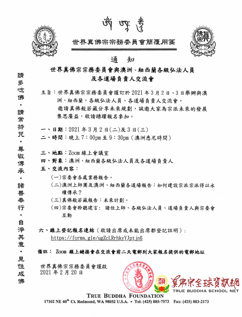 主旨:世界真佛宗宗務委員會謹訂於2021年3月2日、3日舉辦與澳洲、紐西蘭,各級弘法人員、各道場負責人交流會。
