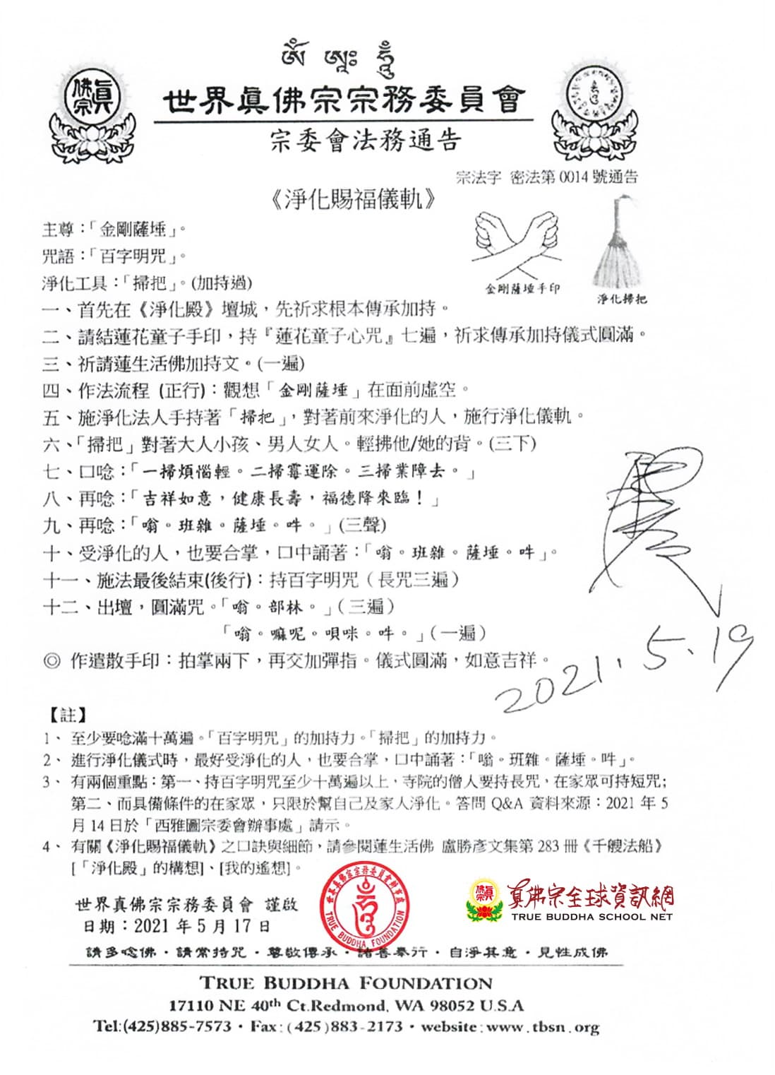 3、 有兩個重點:第一、持百字明咒至少十萬遍以上,寺院的僧人要持長咒,在家眾可持短咒;第二、而具備條件的在家眾,只限於幫自己及家人淨化。答問Q&A資料來源:2021年5月14日於「西雅圖宗委會辦事處」請示。