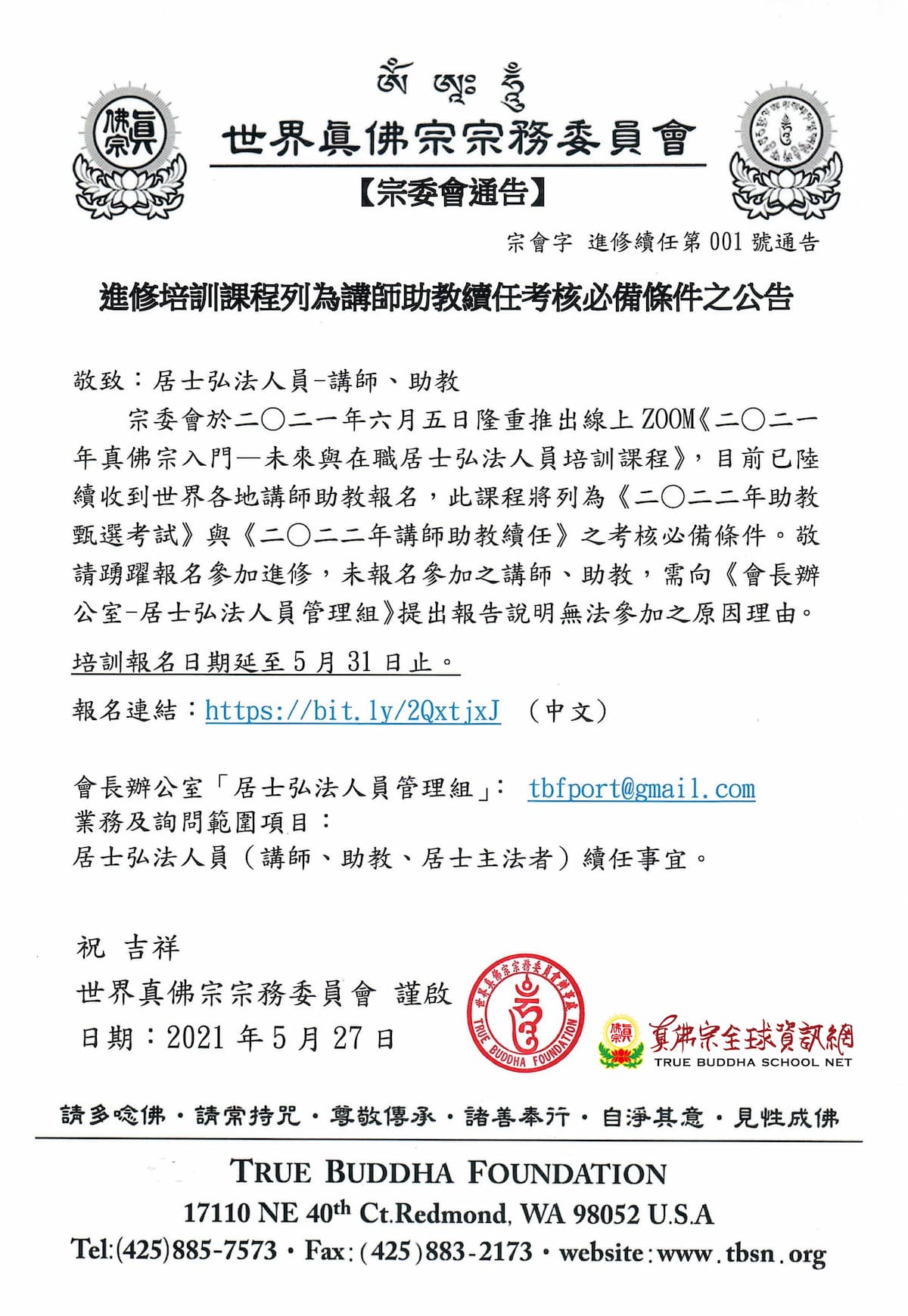 宗委會於二○二一年六月五日隆重推出線上ZOOM《二○二一年真佛宗入門—未來與在職居士弘法人員培訓課程》,目前已陸續收到世界各地講師助教報名,此課程將列為《二○二二年助教甄選考試》與《二○二二年講師助教續任》之考核必備條件。敬請踴躍報名參加進修,未報名參加之講師、助教,需向《會長辦公室-居士弘法人員管理組》提出報告說明無法參加之原因理由。