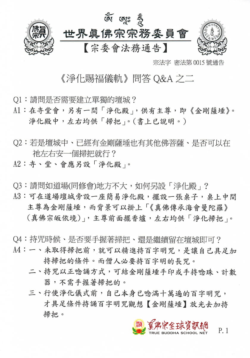 A3:可在道場壇城旁設一座簡易淨化殿,擺設一張桌子,桌上中間主尊為金剛薩埵,而背景可以掛上「《真佛傳承海會曼陀羅》(真佛宗皈依境)」,主尊前面擺香爐,左右均供「淨化掃把」。
