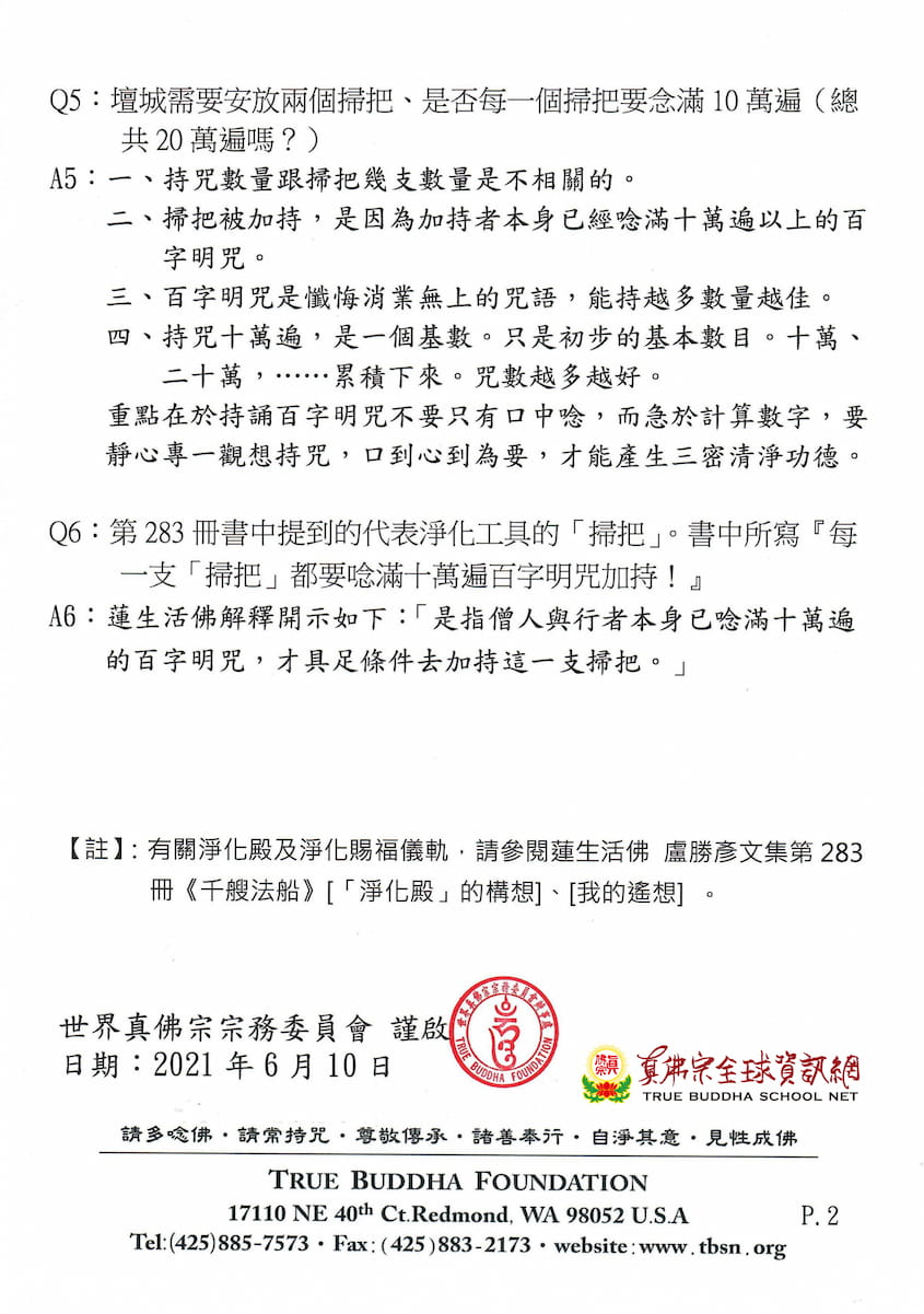 A6:蓮生活佛解釋開示如下:「是指僧人與行者本身已唸滿十萬遍的百字明咒,才具足條件去加持這一支掃把。」
